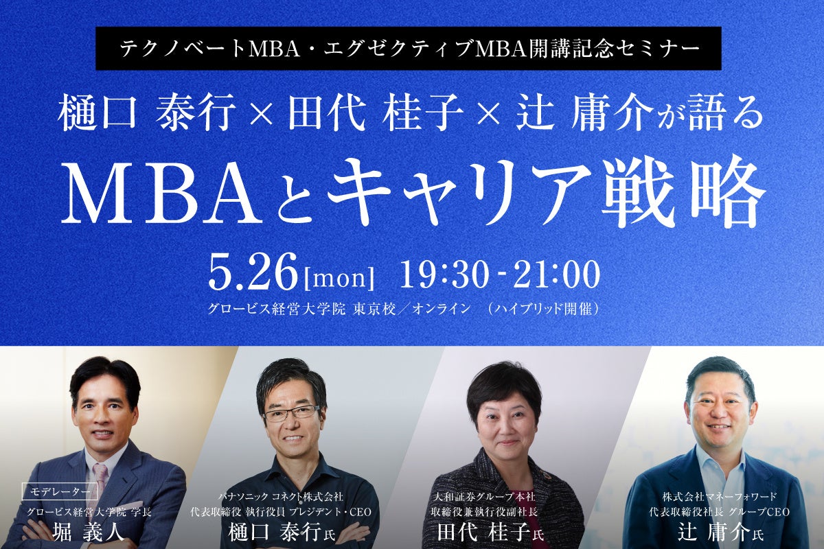エグゼクティブMBAはテクノベートMBAとともに2025年4月から新たに開講されたプログラムで、両プログラムの開講を記念し、樋口泰行氏(パナソニック コネクト株式会社 代表取締役 執行役員 プレジデント)、田代 桂子氏(大和証券グループ本社 取締役兼執行役副社長)、辻 庸介氏(株式会社マネーフォワード 代表取締役社長 グループCEO)を招いたイベントを5月26日(月)に開催予定です。