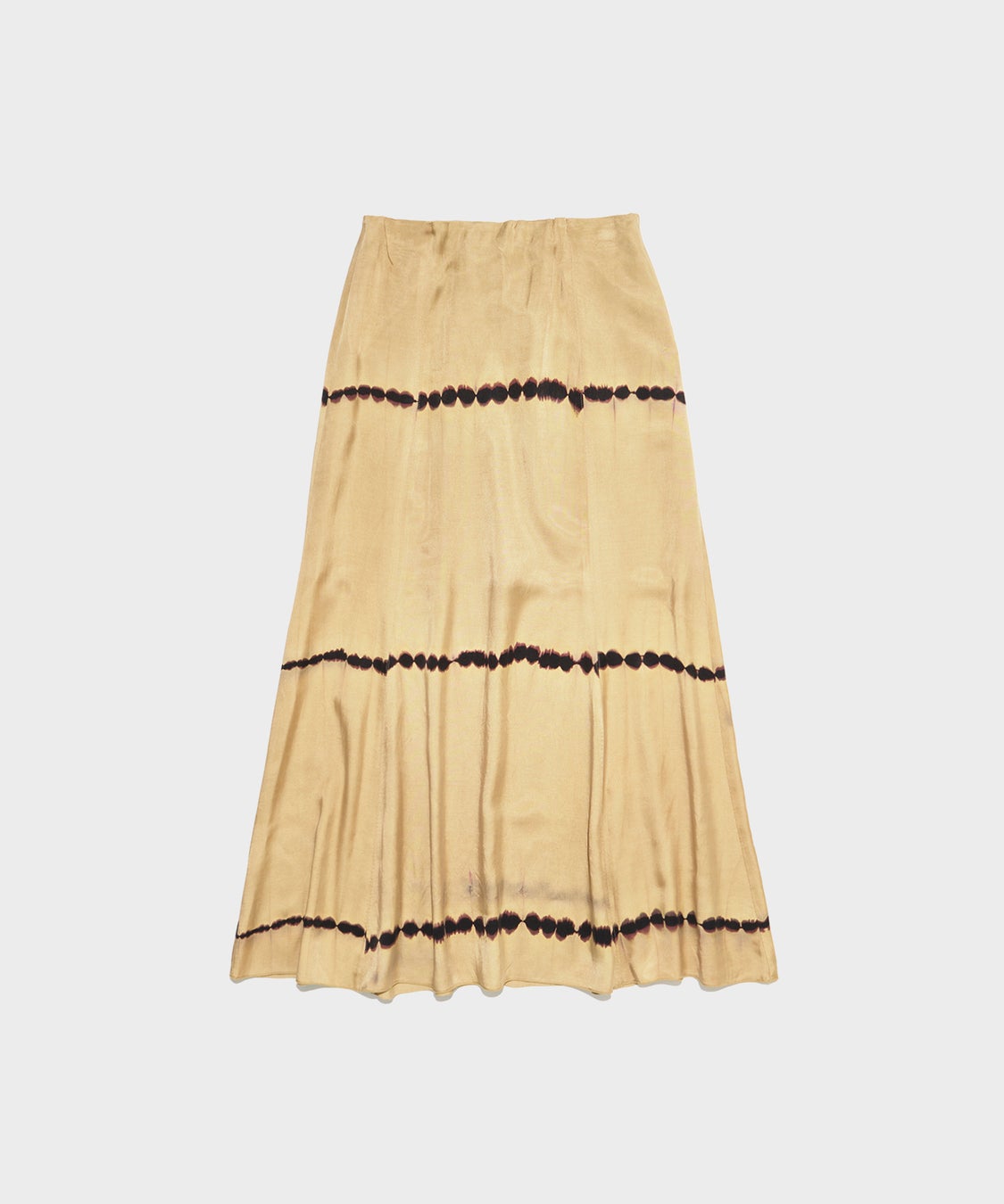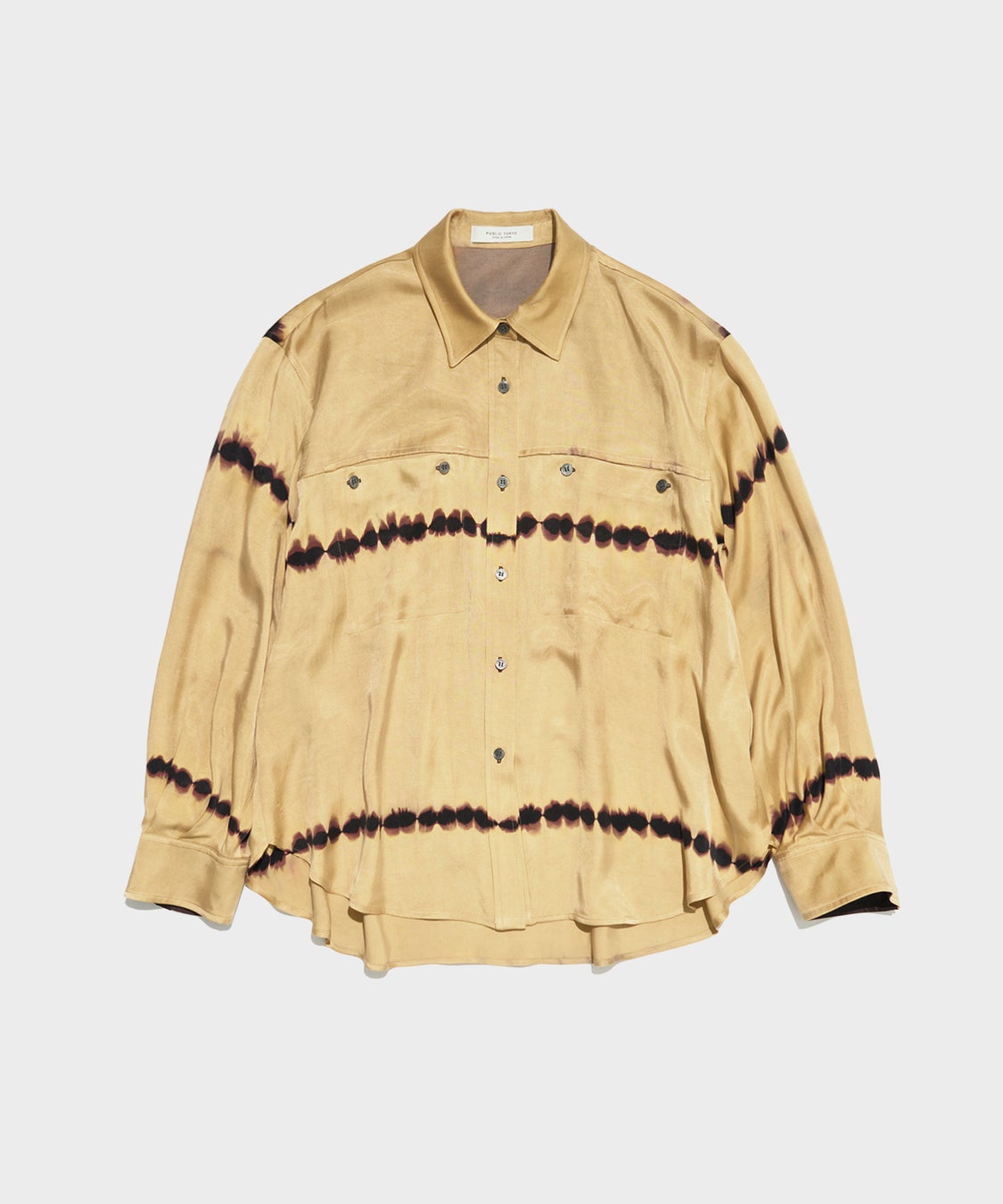 キュプラレーヨンのなめらかな風合いと美しいドレープが特徴のフィブリルサテンを使用。コットンリンター由来の再生繊維キュプラによるサステナブル素材です。京都の職人が手作業で縫い締め絞り染めを施し、繊細で特別な表情に仕上げました。女性らしい抜け感のあるオーバーシャツと、柔らかに広がるソフトマーメイドスカートを同素材で展開。MADE IN KYOTOの上質さを感じられるセットアップです。