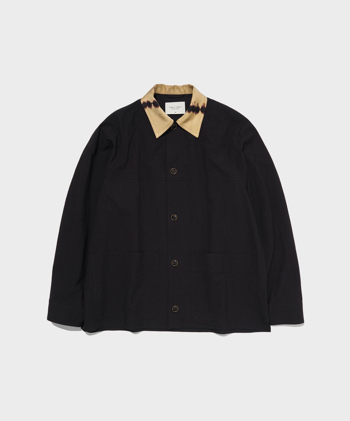 全て京都で仕上げた素材のみを使用したリラックスカバーオール。ボディには京都でウォッシュ加工を施したドライなコットン生地を採用し、軽量でなめらかな着心地が特徴です。衿には「株式会社いづつ」で染め上げた高級感あるフィブリルサテンを配し、手作業による縫い締め絞りで黒からベージュへと染め上げた繊細な表情がアクセントになっています。
