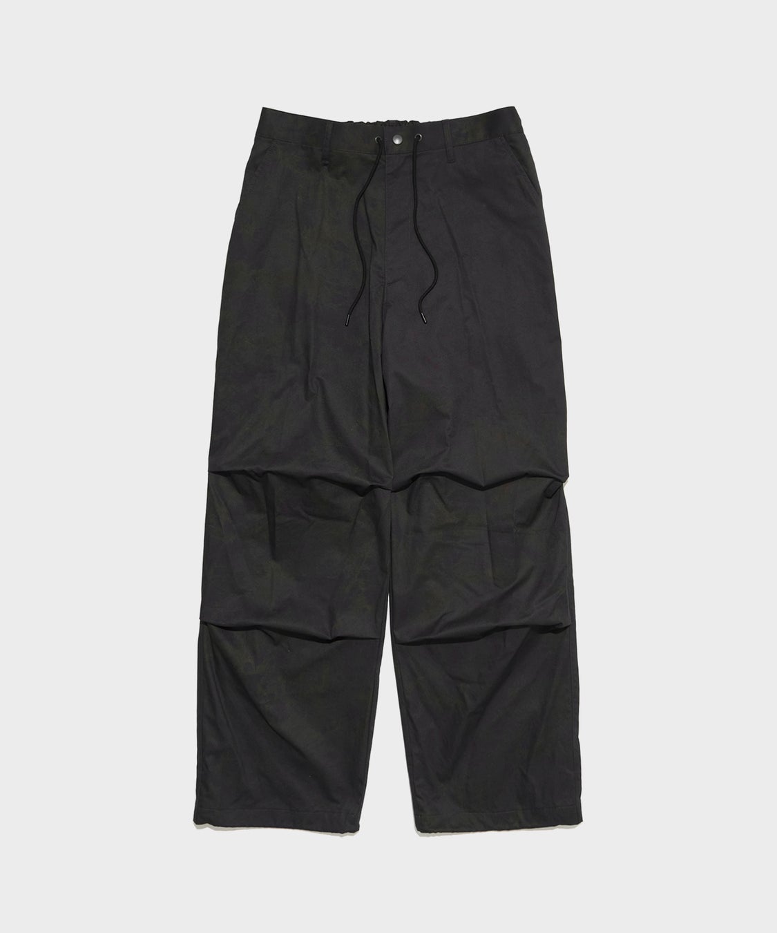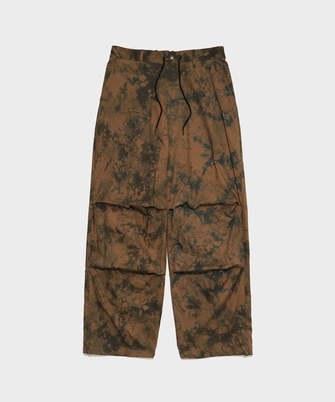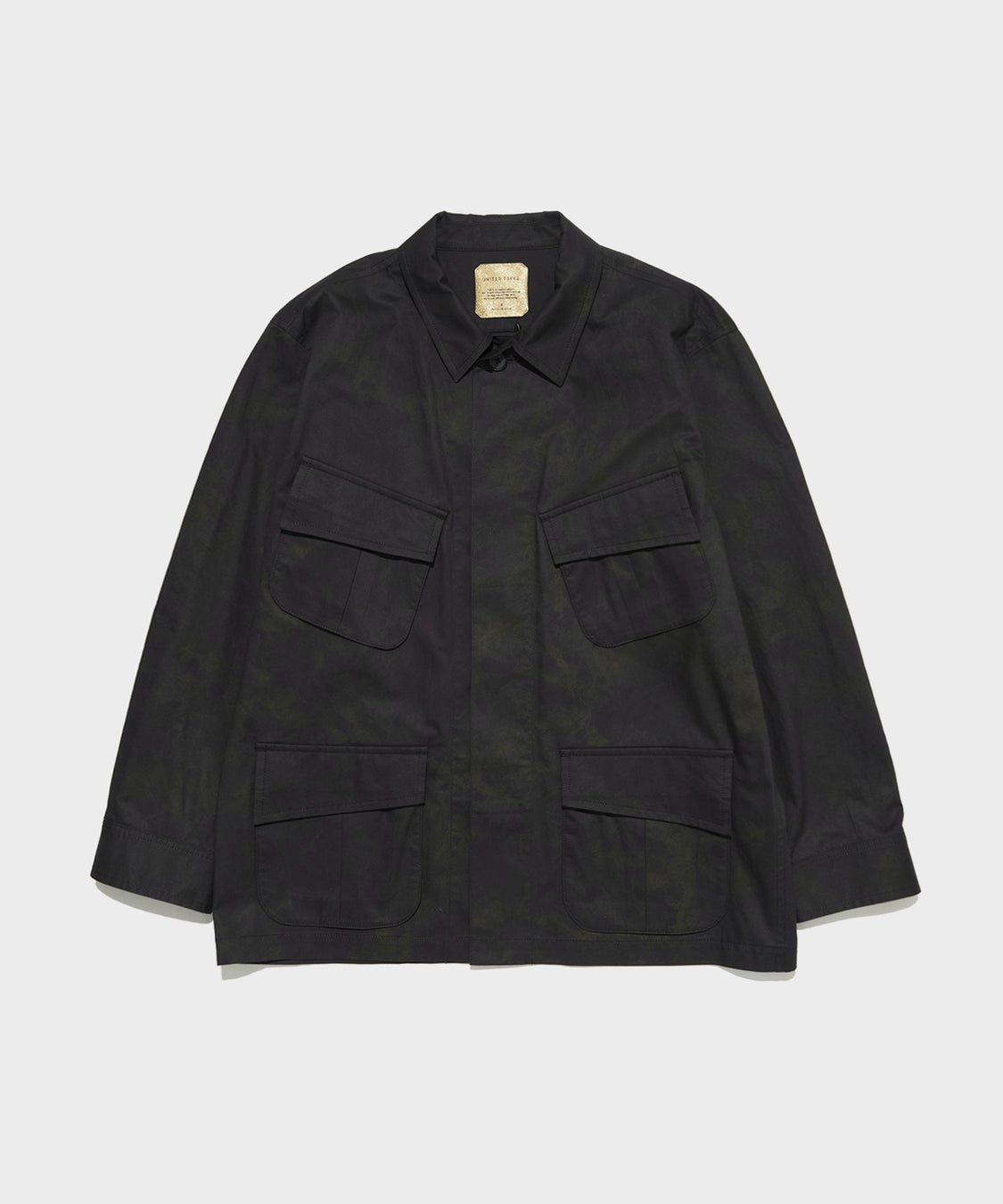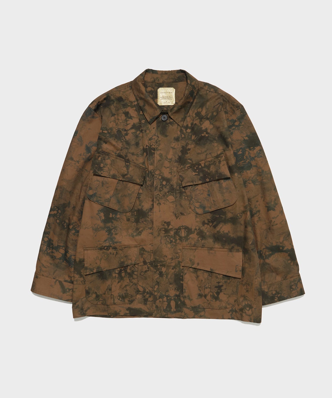 「株式会社いづつ」による群雲(むらくも)染めで加工。日本の伝統技法を用い、US ARMY 60年代後期のグリーンリーフ柄を素材で表現しました。ジャケットはJUNGLE FATIGUEのディテールを活かしながら、裏地を省き軽やかに羽織れる仕様に。パンツはポケットディテールを控えめにすることで、クリーンでミニマルな印象に仕上げた、伝統とモダンが融合した一着です。