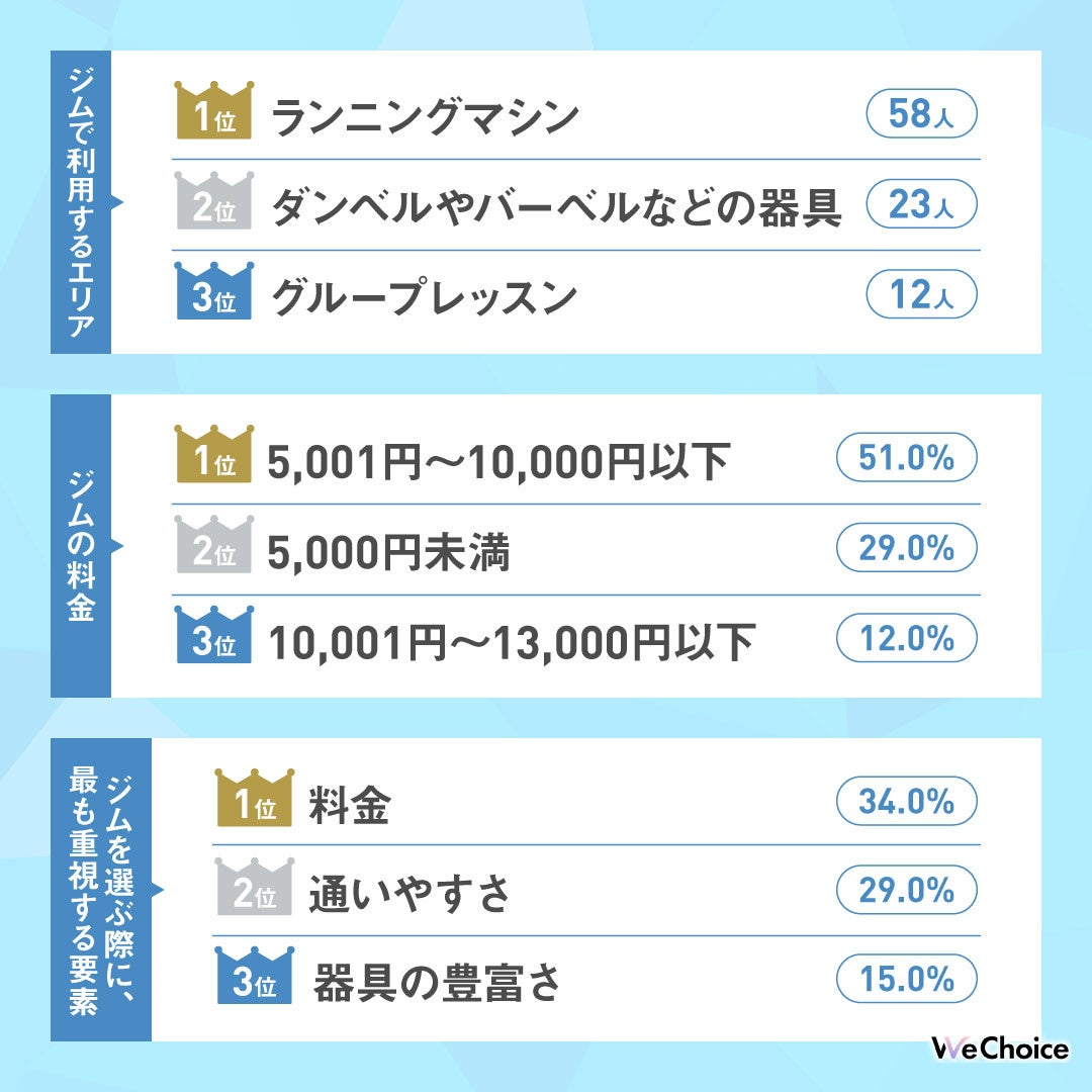 【ジムで利用する主な設備、エリアは何ですか?また、ジムを選ぶ際に最も重視する要素は何ですか?】