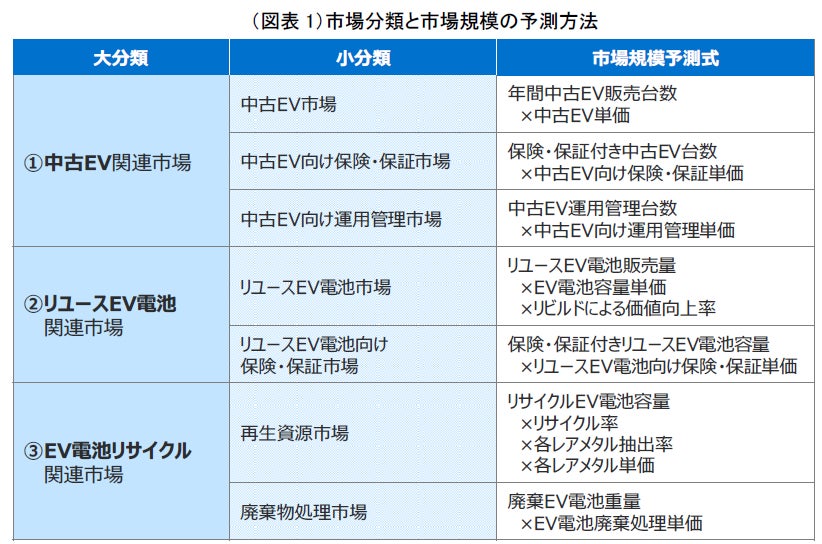 EV電池の市場について、利用段階ごとに、①中古EV関連市場、②リユースEV電池関連市場、③EV電池リサイクル関連市場の3つに分類し(図表1)、それぞれの市場規模を予測しました(図表2)。