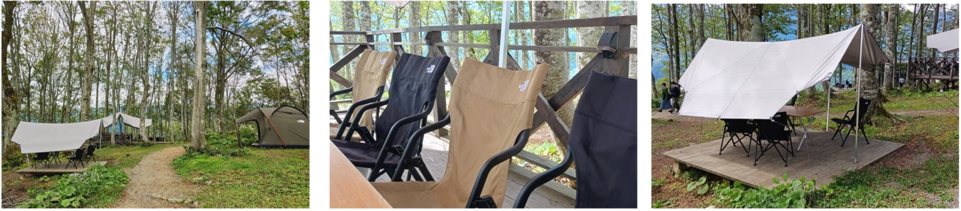 そしてこの度、山頂の涼しいブナ林の中で仕事もできる「森のオフィス」エリアを優れた性能とデザイン性で人気の世界的アウトドアブランド「THE NORTH FACE」のサポートのもと、 10月12日(土)よりリニューアルオープンします。標高約1,200mのエリアにテント、タープ、テーブル、チェアなどを設置し、より自然と調和する空間を提案します。森の中、ファッショナブルな雰囲気を醸し出す同エリアで、自由に各種ギアを体験いただけます。簡単に設営することができ、広い居住スペースが魅力のテント「Lander」シリーズや、遮光性と難燃性に優れた素材を採用し、様々な設営アレンジができるタープ「Nebula Tarp 6 TC」、アームレストを本体フレームと一体化したシンプルなデザインと高い耐久性が特徴のチェア「TNF Camp Chair Slim」など、人気の商品を多数取り揃えました。森の中でリラックスする時間や、ショップやオンライン販売ではなかなかできない、実際のフィールドに設営した「THE NORTH FACE」のアウトドアギアを体感いただける機会をご提案いたします。さらに同エリアでは、電源やWi-Fiなども完備。森の中、爽やかな風に吹かれる快適な作業環境で、生産性やクリエイティビティの発揮をサポートします。