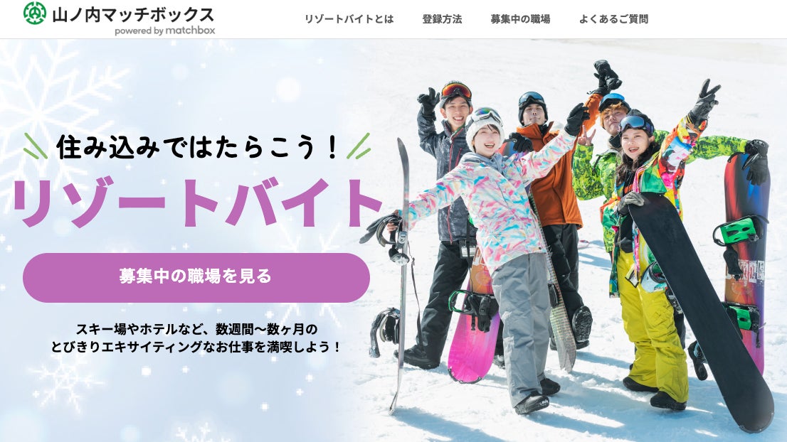 株式会社Matchbox Technologies(マッチボックステクノロジーズ 本社:新潟県新潟市中央区、代表取締役社⻑:佐藤 洋彰)は1日・数時間単位の求人と働き手をオンラインでマッチングする自治体公式のスポットワーク※1プラットフォームの構築・運用をサポートしています。マッチボックステクノロジーズは2024年12月から、リゾートバイト(住み込みをともなうアルバイト)求人に対応します。マッチボックステクノロジーズは様々な自治体と連携し、自治体公式のスポットワークプラットフォームを開設しており、今回、リゾートバイト初の実施として長野県下高井郡山ノ内町(町長:平澤 岳 ひらさわ がく)と「山ノ内町求職求人マッチングシステム導入業務」として開設した「山ノ内マッチボックス」(URL:https://matchbox.jp/nagano/yamanouchi)にて、リフト券付きの志賀高原リゾートスキー場の求人などを始めとした18事業所がリゾートバイトの募集を開始します(山ノ内町リゾートバイト特設サイトURL:https://matchbox.jp/nagano/yamanouchi/resort_work)。