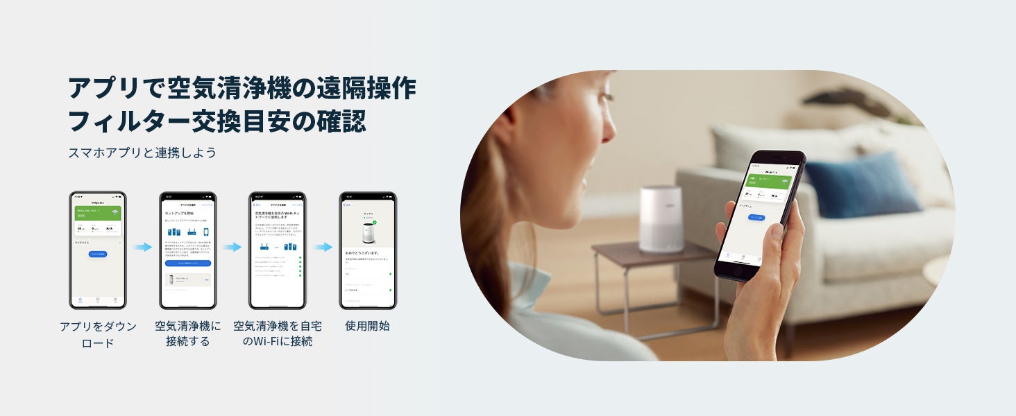 いつでも、どこでもスマートフォンで操作可能。また、アプリではフィルターの交換時期の確認や、遠隔操作などが可能です。