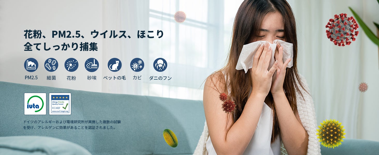NanoProtect HEPA、プレフィルターを備えた2層フィルターにより、ホコリ、真菌、ウイルス、細菌、カビ、アレルゲン、花粉、PM2.5、ペットの毛など、あなたの悩みを解決します!プレフィルター層がほこりや動物の毛などの大きな粒子を捕捉でき、NanoProtect HEPA フィルターが微粒子やエアロゾルなど、0.003 μm程度の粒子は99.97%を捕捉できます。