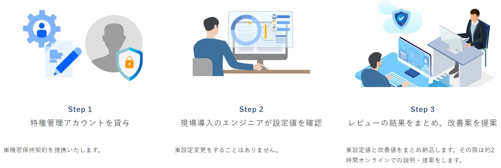 経験豊富なエキスパートが、貴社の Google Workspace の管理設定を評価し、 リスクとなり得る箇所を特定、具体的な改善案をご提案するサービスです。
