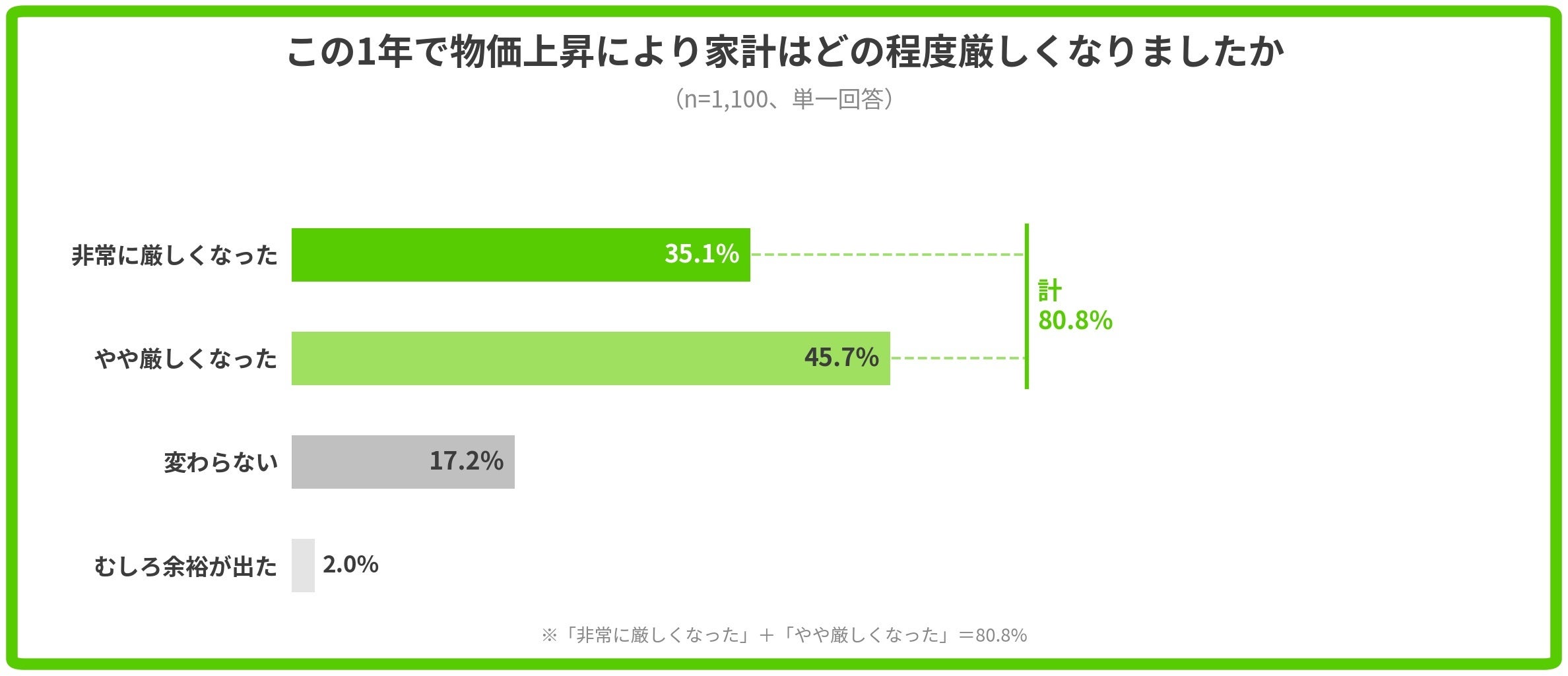 「この1年で物価上昇により家計はどの程度厳しくなりましたか」と聞いたところ、「非常に厳しくなった」(35.1%)と「やや厳しくなった」(45.7%)を合わせた80.8%が家計への打撃を実感していました。