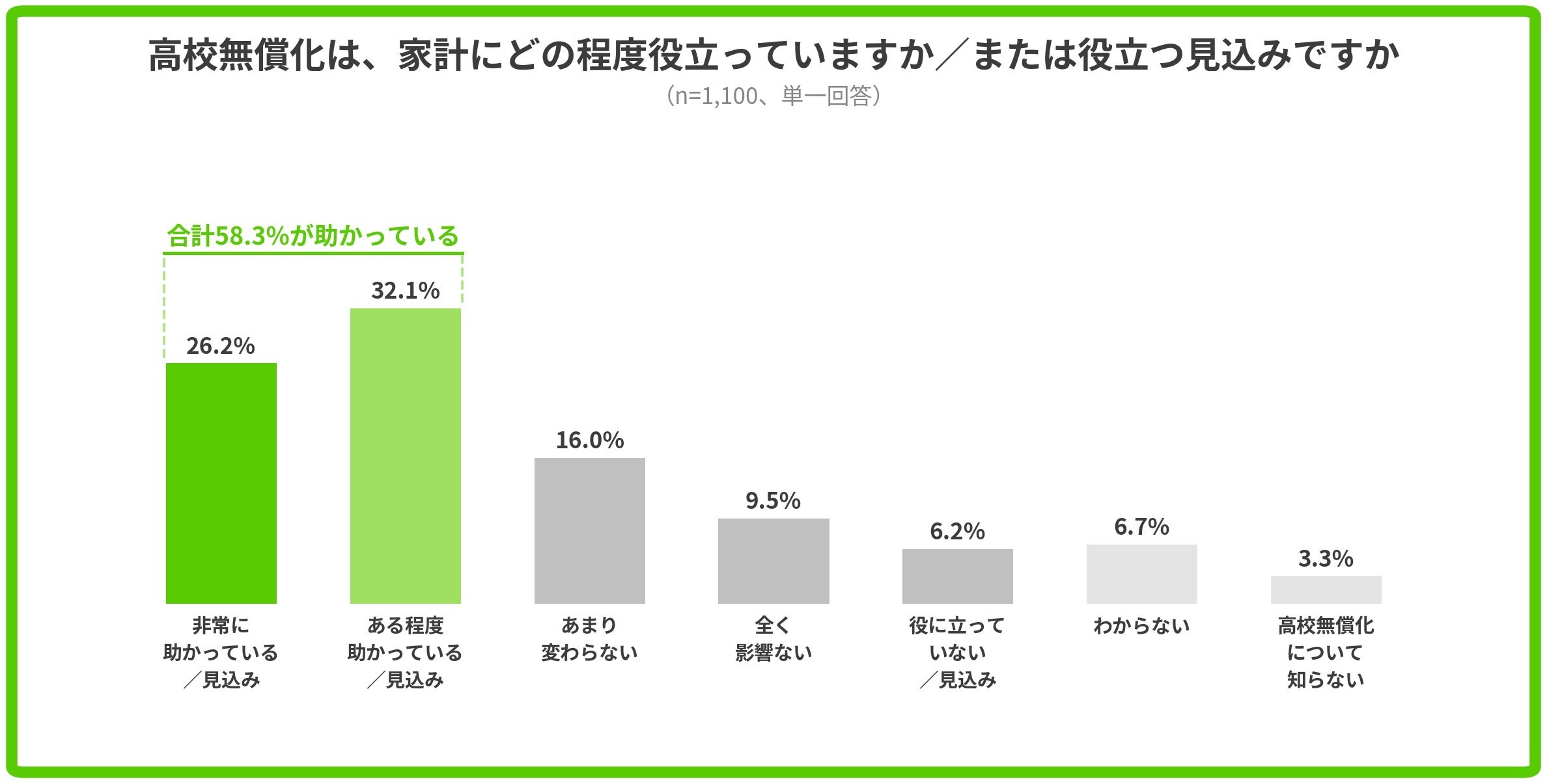高校無償化が「家計に助かる(または助かる見込み)」と感じる保護者は58.3%と過半数