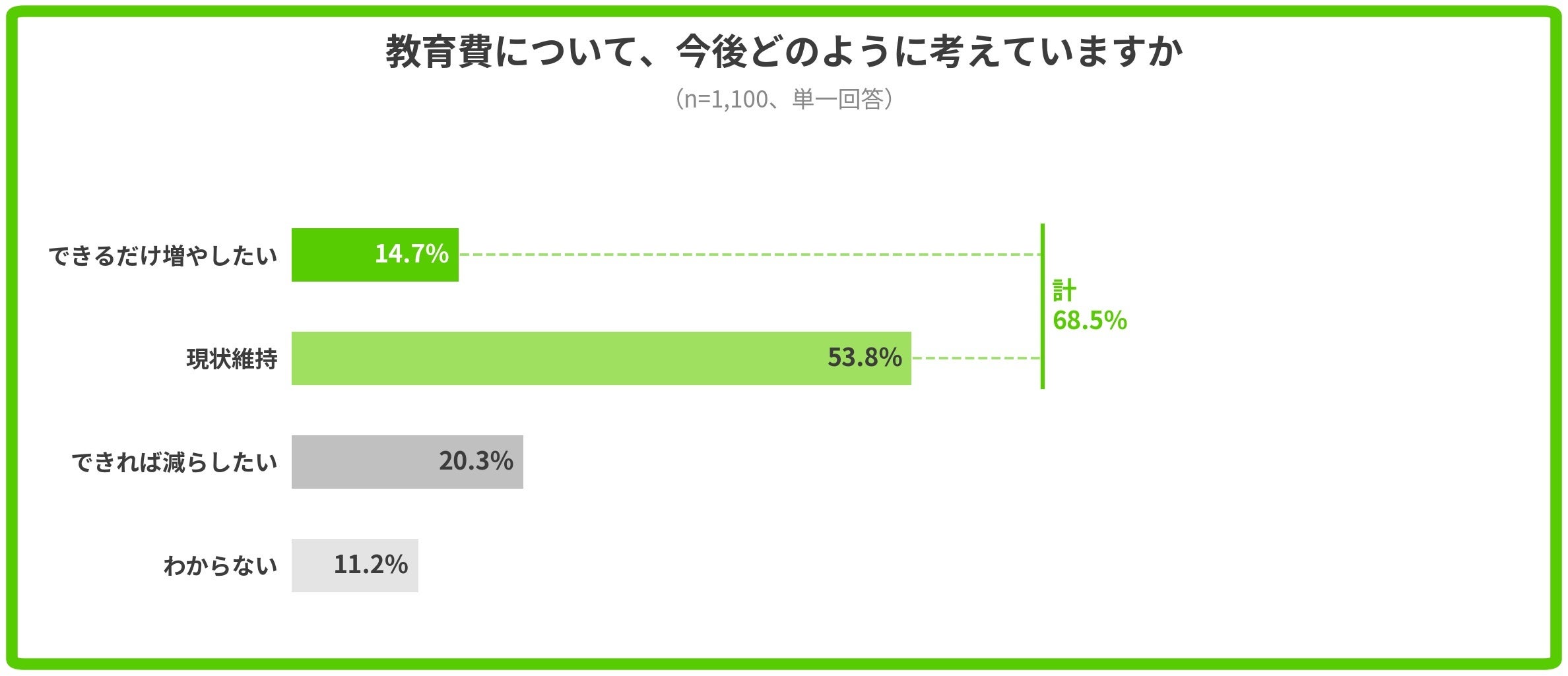 「教育費について、今後どのように考えていますか」では、「できるだけ増やしたい」(14.7%)と「現状維持」(53.8%)を合わせた68.5%が教育費の維持・拡大を望んでいました。