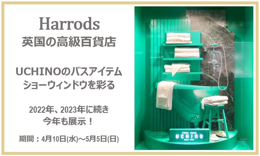 バスタイムから快眠まで、健やかで心地よいライフスタイルを提案する内野株式会社(本社:東京都中央区/代表取締役社長:内野信行)は、英国高級百貨店「Harrods」のショーウィンドウに上質なバスタイムを演出するアイテムとしてタオル、スリッパ、パジャマの数々が登場したことをお知らせいたします。今年のコンセプトは「ラグジュアリーなホームスパ体験」。メインストリートに面したショーウィンドウに、現地時間2024年4月10日(水)から5月5日(日)までの期間、ディスプレイされます。(https://www.uchino.co.jp/)
