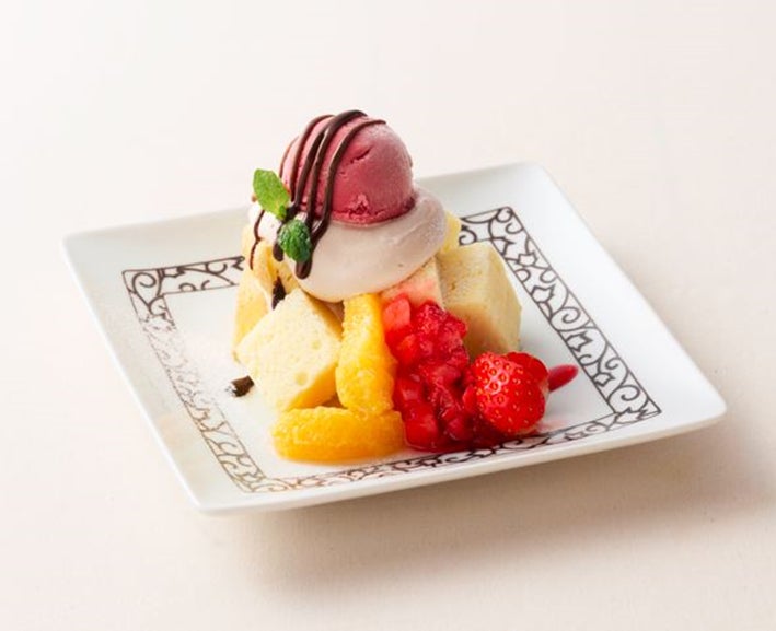 甘酸っぱいフランボワーズジェラートやバレンシアオレンジの下に、しっとりとした冷たい元町シフォンが隠れています。