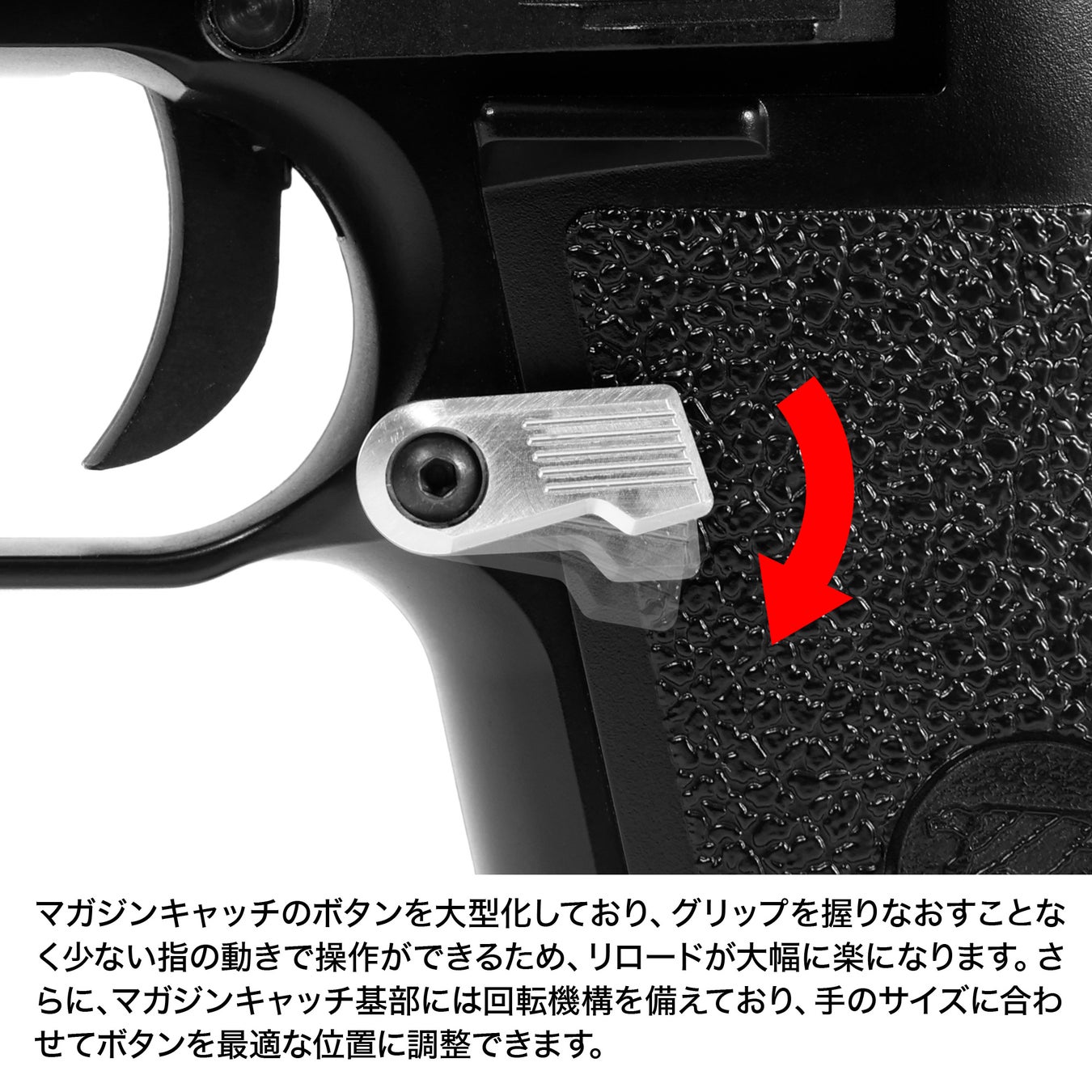 ボタン面積を拡大することで、指先が触れる面を広く確保。加えてマガジンキャッチ基部に回転機構を搭載し、ボタン位置を微調整できます。手の大きさや握りのクセ、グローブの厚みまでを見据えた設計。
