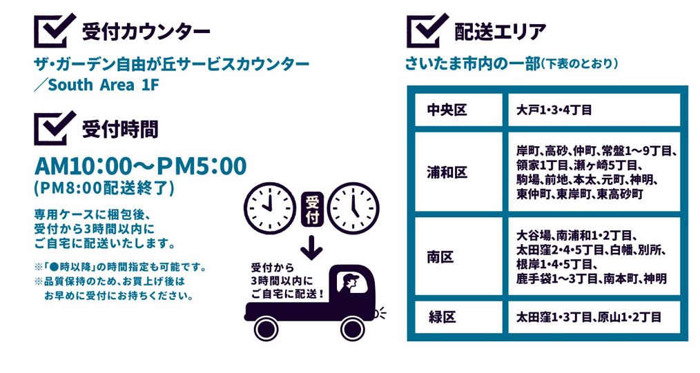 株式会社アトレ(本社:東京都渋谷区/代表取締役社長:一ノ瀬 俊郎)が運営するアトレ浦和(所在地:埼玉県さいたま市浦和区)では、2022年7月1日(金)より、食料品即日配送サービス「atre Home Deliverly(アトレ ホームデリバリー)」をスタートします。JR浦和駅周辺の約8万世帯を対象に、対象ショップの店頭でお買い上げいただいた商品を3時間以内にご自宅にお届け、手ぶらでお買い物を叶えます。
