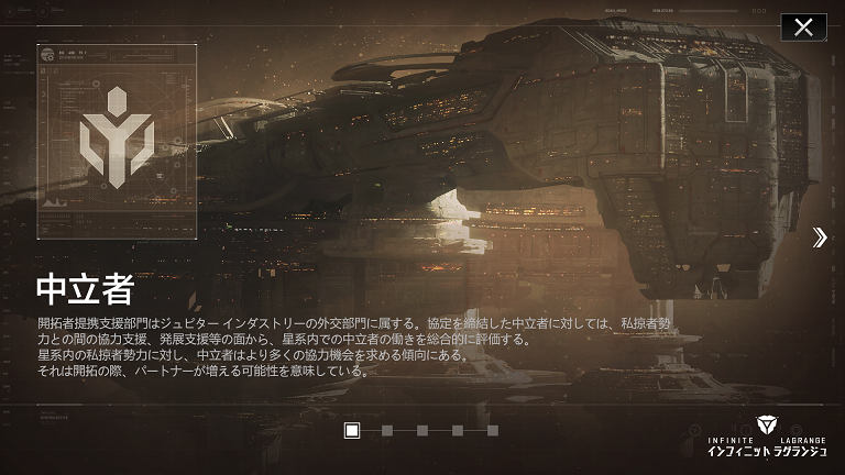 中立者協定はジュピター インダストリー提携支援部門が提供しています。業界を牛耳るこの艦船設計製造企業は、開拓者たちに私掠者と星系勢力との懸け橋、そしてラグランジュ ネットワーク独自の「外交官」となることを期待しています。
