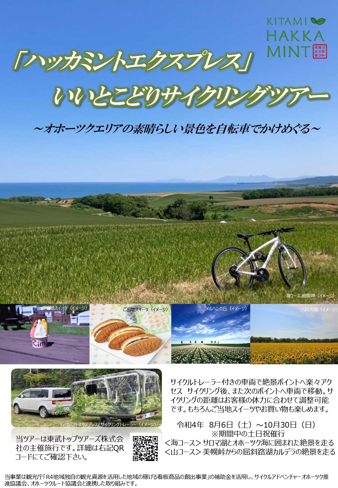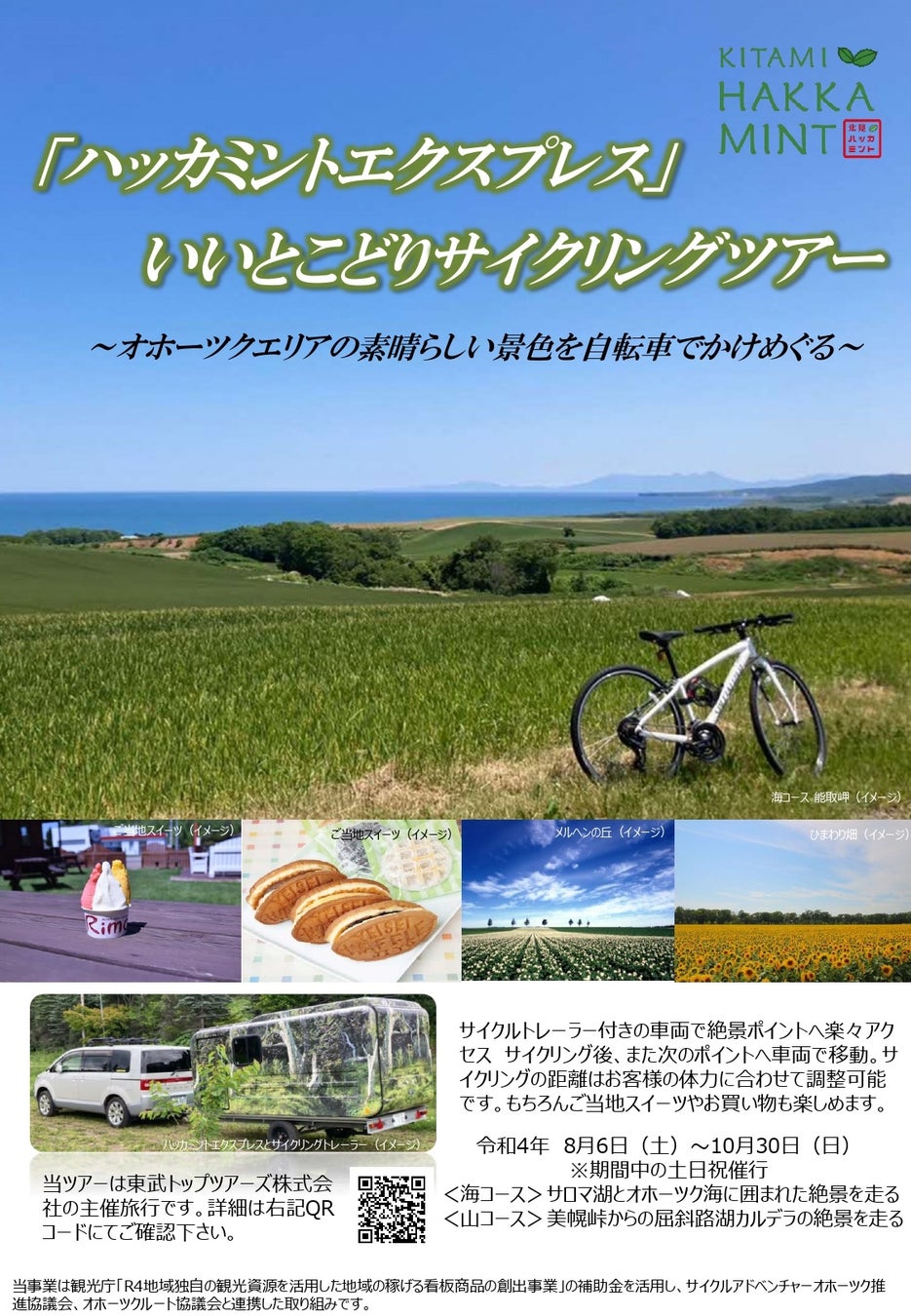 東武トップツアーズ株式会社(本社:東京都墨田区、社長:百木田康二)は、観光庁の「地域独自の観光資源を活用した地域の稼げる看板商品の創出事業」の取組として、サイクルアドベンチャーオホーツク推進協議会、オホーツクルート協議会と連携し、サイクルトレーラー付きの車両を利用してオホーツクエリアの素晴らしい景色を自転車で駆け巡るユニークな日帰りサイクリングツアー「ハッカミントエクスプレス」を販売することとなりましたので、お知らせします。