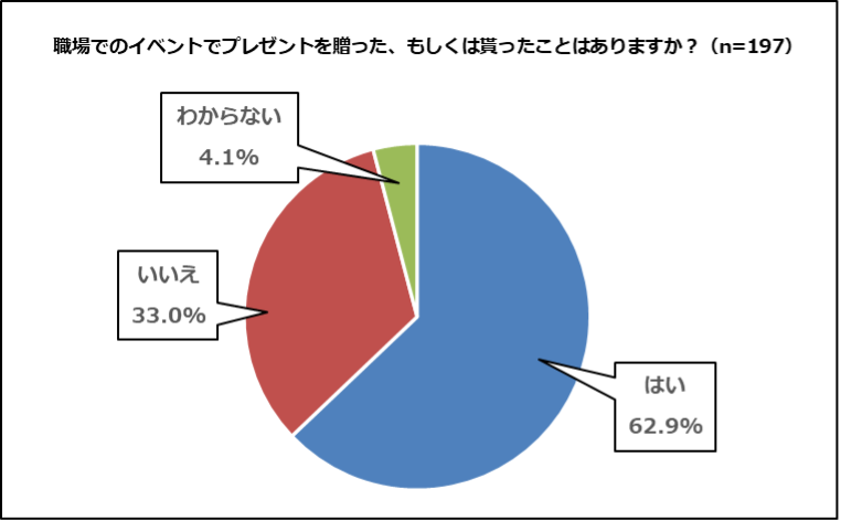 イベントがあると答えた人のうち、プレゼントを贈った/貰った経験について尋ねたところ、62.9%があると回答しました。職場のイベントが重要なコミュニケーション機会になっていることが分かります。
