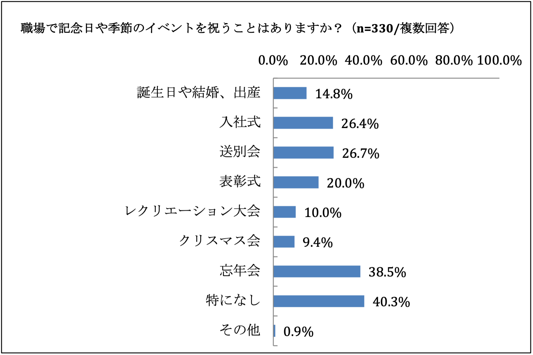 ・職場のイベントでは「忘年会」「送別会」「入社式」が多い