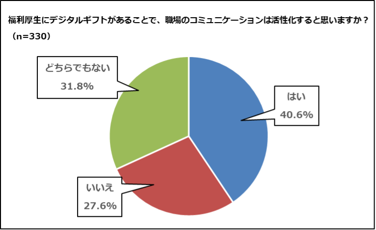 デジタルギフトを福利厚生にすることでコミュニケーションの活性化につながるかという質問に対し、「はい」と答えた人は40.6%にのぼりました。