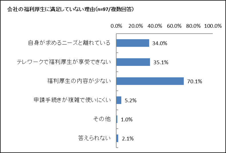 不満がある理由としては「福利厚生の内容が少ない」が最も多く、「自身が求めるニーズと離れている」「テレワークで福利厚生が享受できない」が、それぞれ30%以上となりました。