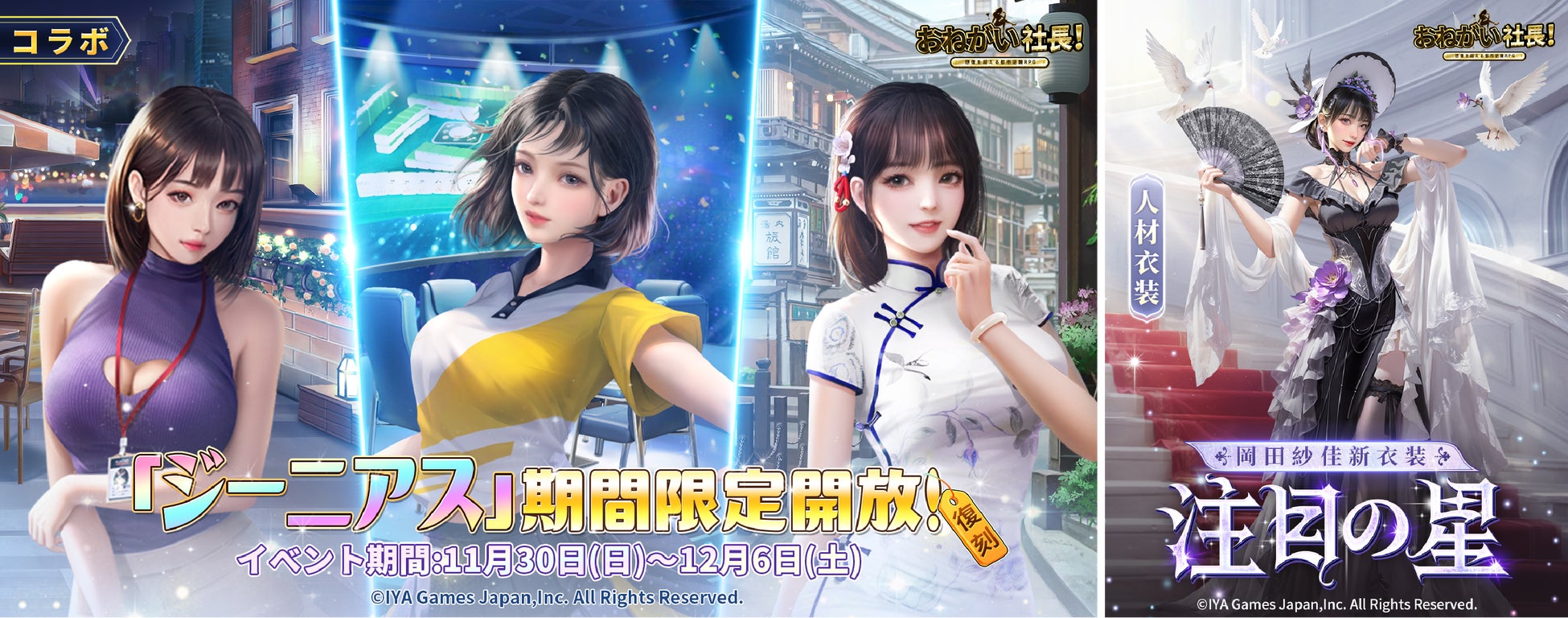 この度、スマートフォン向けゲーム「おねがい社長!」は、プロ雀士の「岡田紗佳」、「伊達朱里紗」、「瀬戸麻衣」の3名とのコラボレーションを、2025年11月29日(土)から12月25日(木)までの期間限定で開催することを発表いたします。