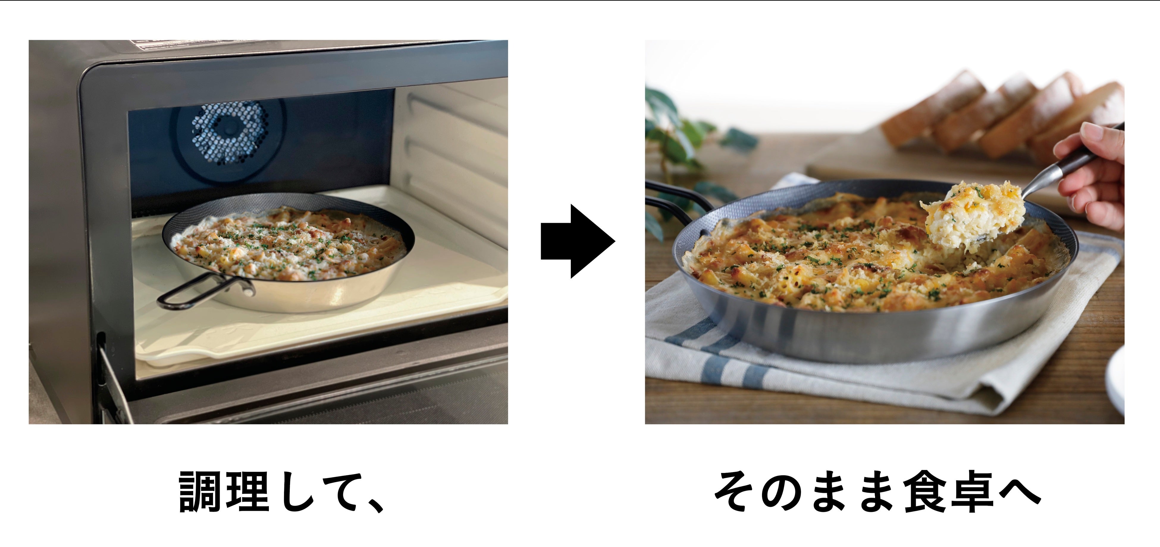 オーブン用に耐熱容器に食材を移す手間も要らず、調理時に使うお皿も最小限に抑えられます。保温効果があるので、調理後そのまま食卓に並べても美味しく召し上がることができます。食卓に並べた時もオシャレに魅せることができます。