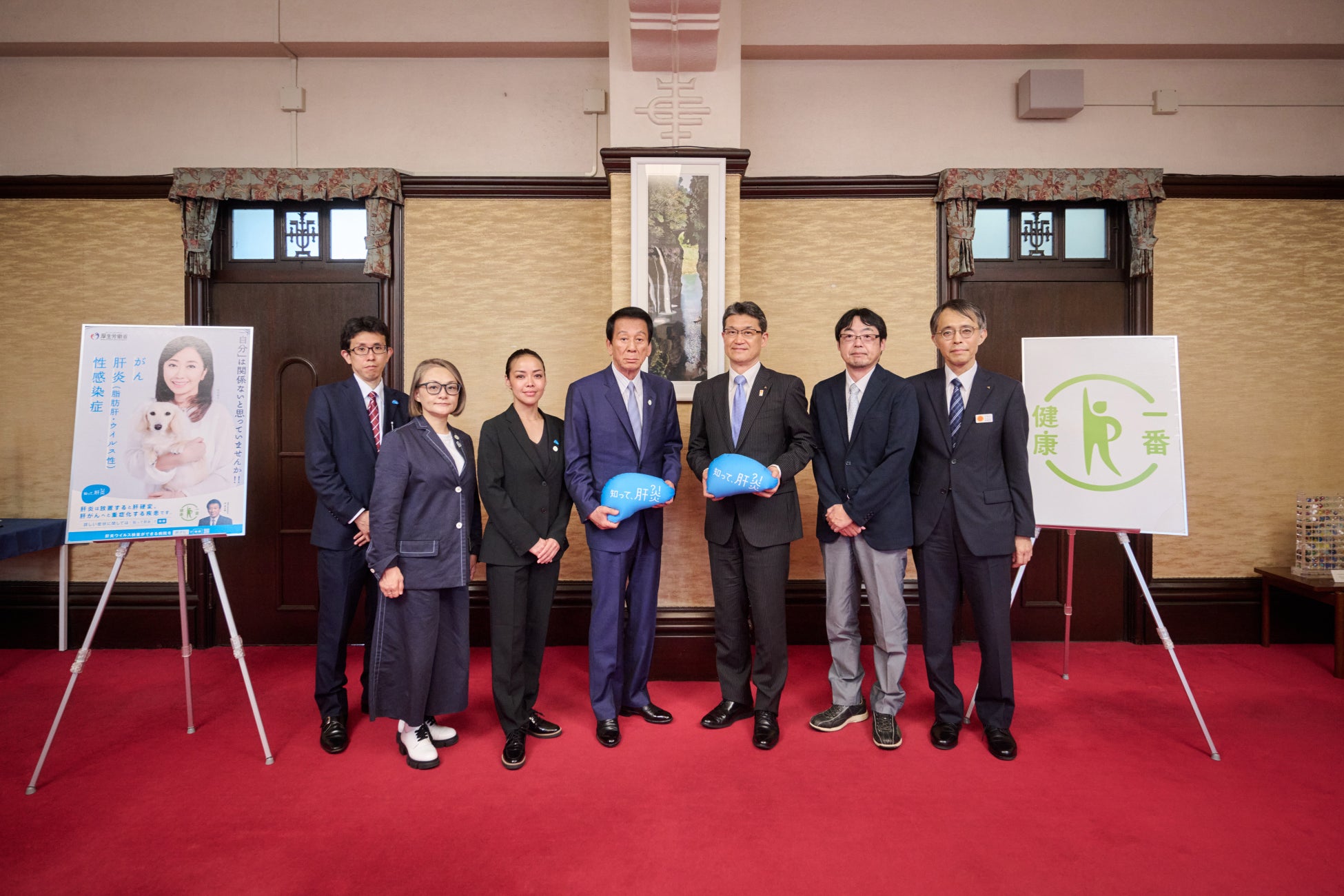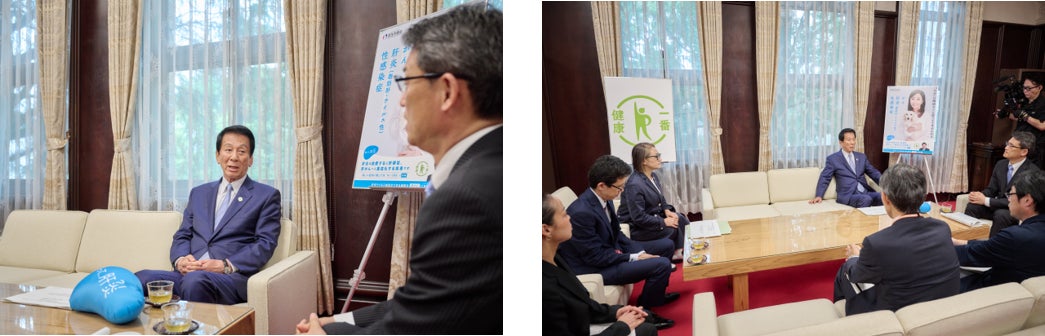 都城市でのイベント後には、宮崎県庁を訪れて、河野知事や宮崎大学医学部 内科学講座消化器内科学分野 准教授肝疾患センター長の永田氏らと懇談を行いました。