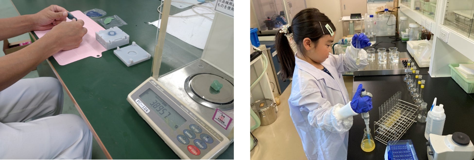 左:ゴム製造スタッフの仕事(シリコーンゴム材料を使用して混練作業を行った後、簡易金型でゴムの成型を行う)