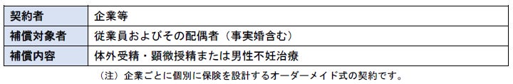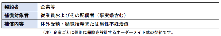 体外受精・顕微授精または男性不妊治療を受けた従業員およびその配偶者に対し、企業等が社内規定に基づき、不妊治療給付金をお支払いした費用を保険金としてお支払いします。
