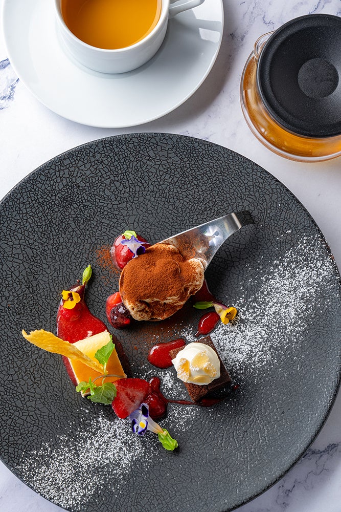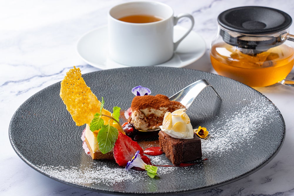 ■チーズを使ったミア・ボッカ自慢のデザート3種と、食べられるお花エディブルフラワーを添えて午後のひとときを華やかに演出いたします。