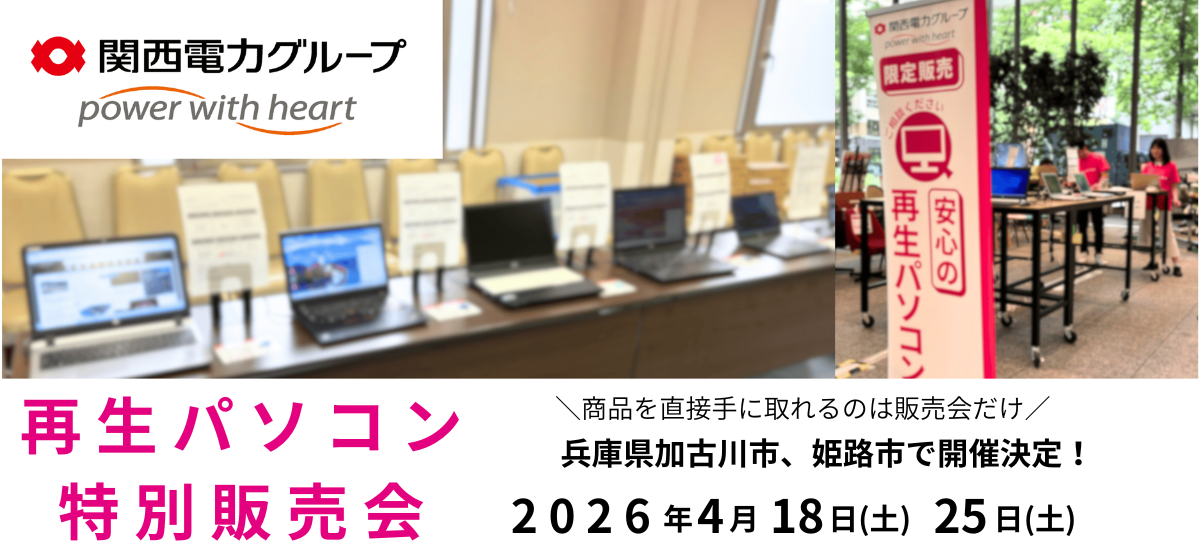 株式会社ポンデテック(関西電力グループ)が運営するPC next は、2026年4月に兵庫県加古川市と兵庫県姫路市で「再生パソコン特別販売会」を開催します。