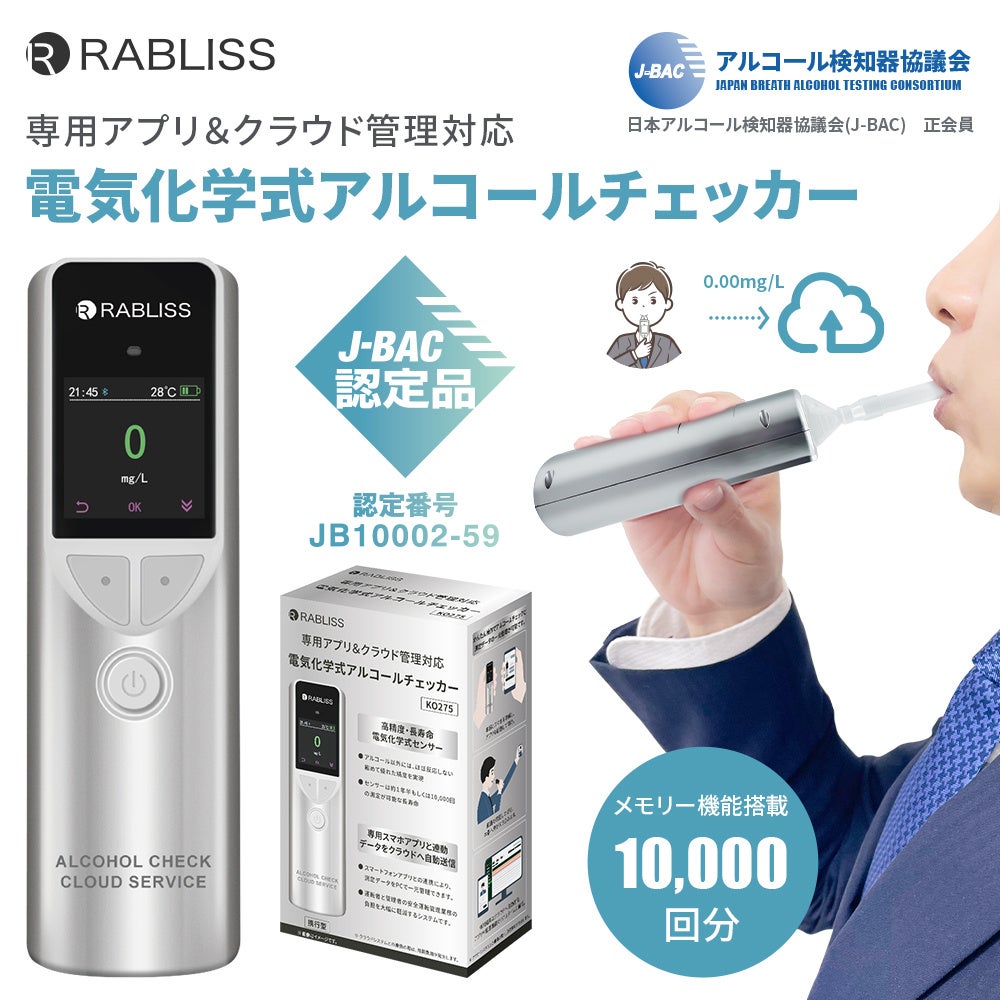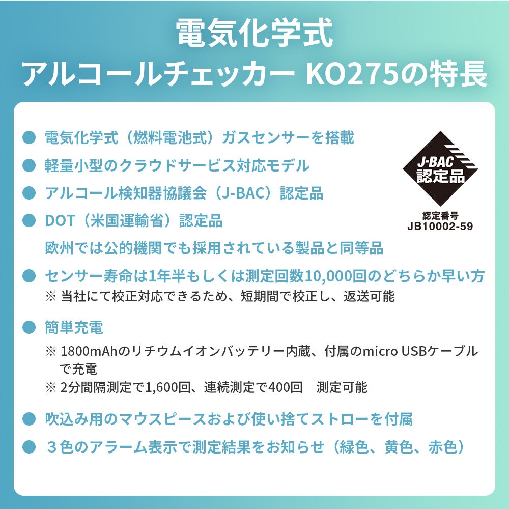 アルコール検知器協議会(J-BAC)認定品 電気化学式アルコールチェッカー KO275 は、クラウドサービス対応や、電気化学式センサーによる高精度・高耐久の検査能力で皆様の業務をお助けします。
