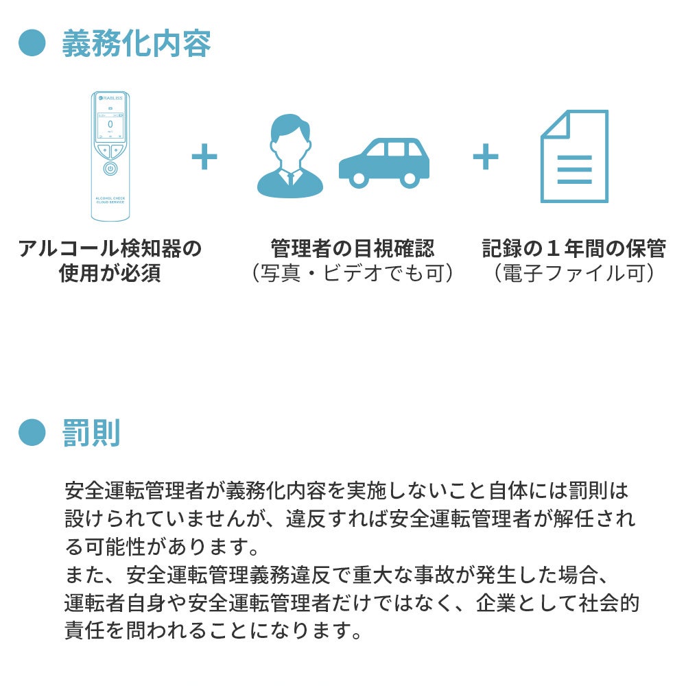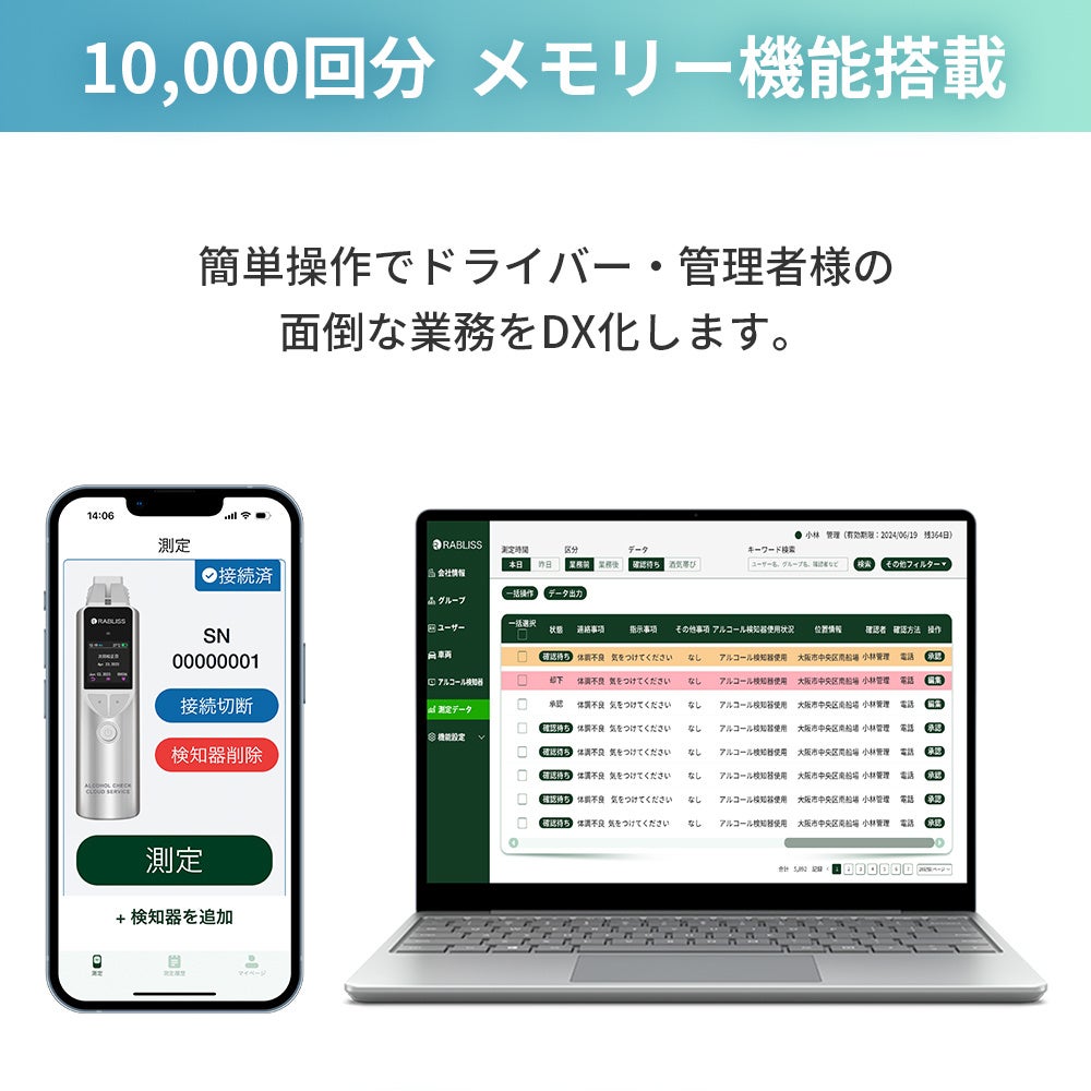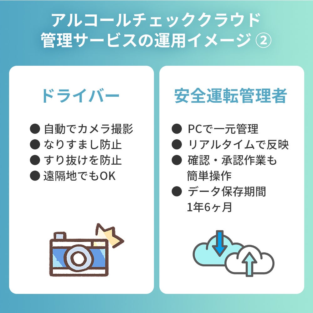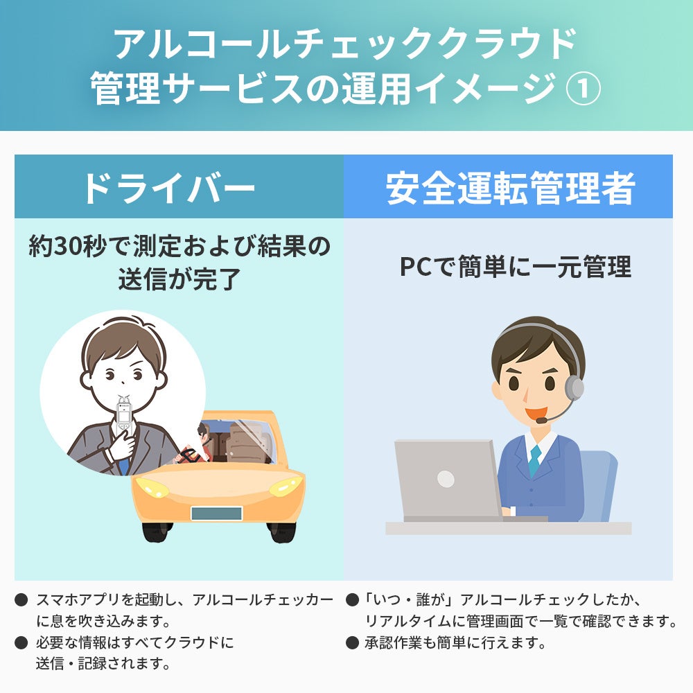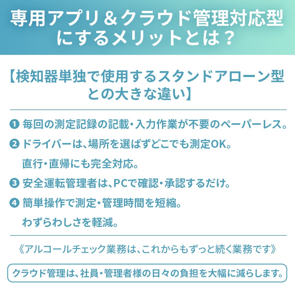 クラウドサービスを利用することで運転者、管理者ともに検査業務の負担を大幅に軽減でき、且つ本体の高精度な検査能力で、安心して本来の業務に専念していただける機器です。