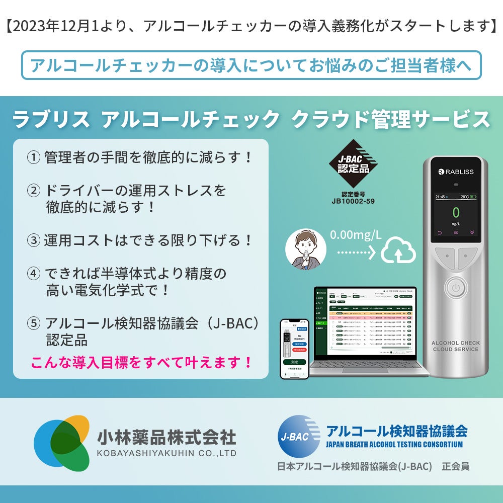 クラウド管理でアルコール検査業務の負担を大幅に軽減できる、小林薬品の電気化学式アルコールチェッカー KO275が アルコール検知器協議会の認定機器となりました。