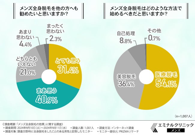 また、全身脱毛を経験した男性の7割は他の人にもメンズ全身脱毛を勧めたいと考えており、脱毛を始めるなら「医療脱毛」を選択するべきだと答えた方が過半数を超える結果となりました。