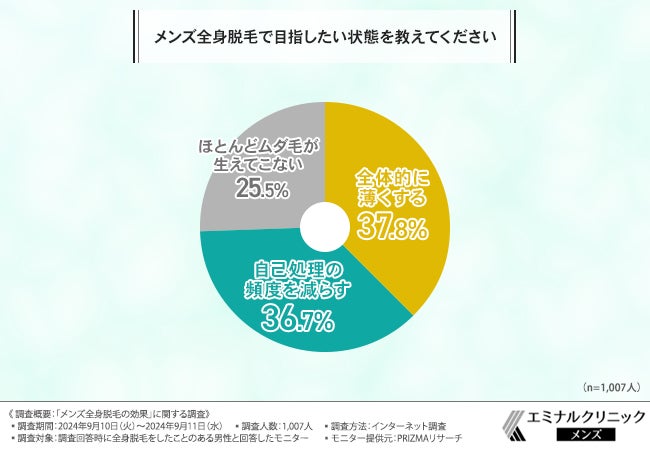「メンズ全身脱毛で目指したい状態を教えてください」と質問したところ、『全体的に薄くする(37.8%)』『自己処理の頻度を減らす(36.7%)』『ほとんどムダ毛が生えてこない(25.5%)』という回答結果になりました。