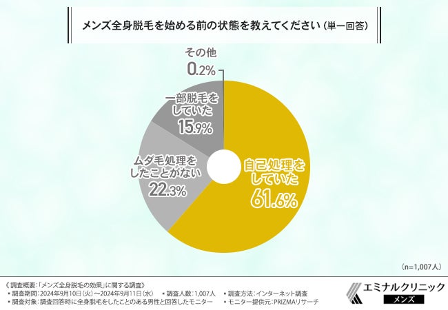 はじめに、「メンズ全身脱毛を始める前の状態を教えてください(単一回答)」と質問したところ、『自己処理をしていた(61.6%)』と回答した方が最も多く、次いで『ムダ毛処理をしたことがない(22.3%)』『一部脱毛をしていた(15.9%)』となりました。
