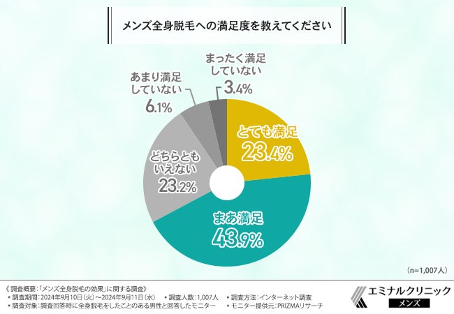 「メンズ全身脱毛への満足度を教えてください」と質問したところ、7割近い方が『とても満足(23.4%)』『まあ満足(43.9%)』と回答しました。
