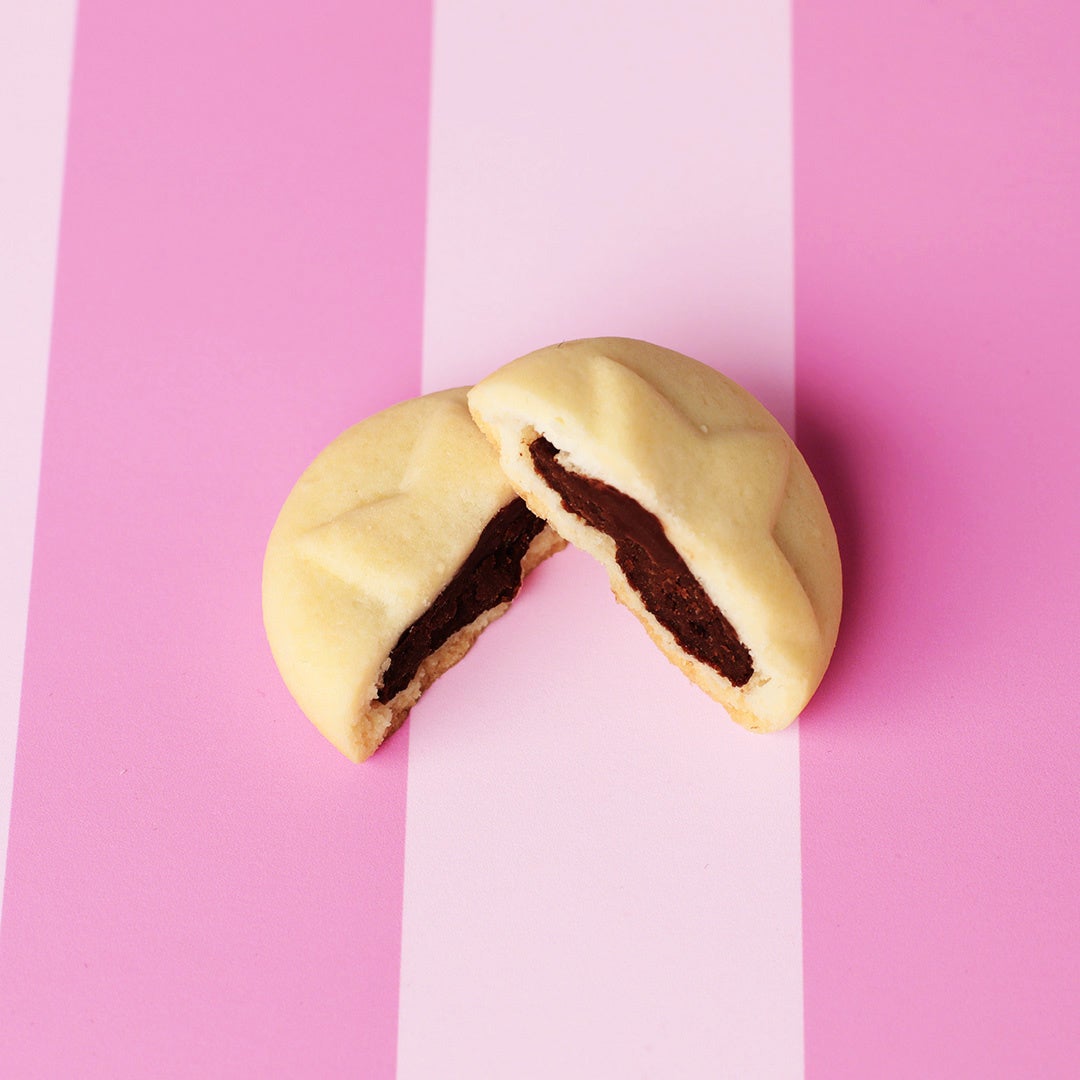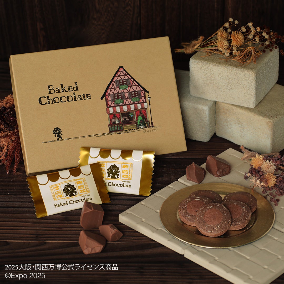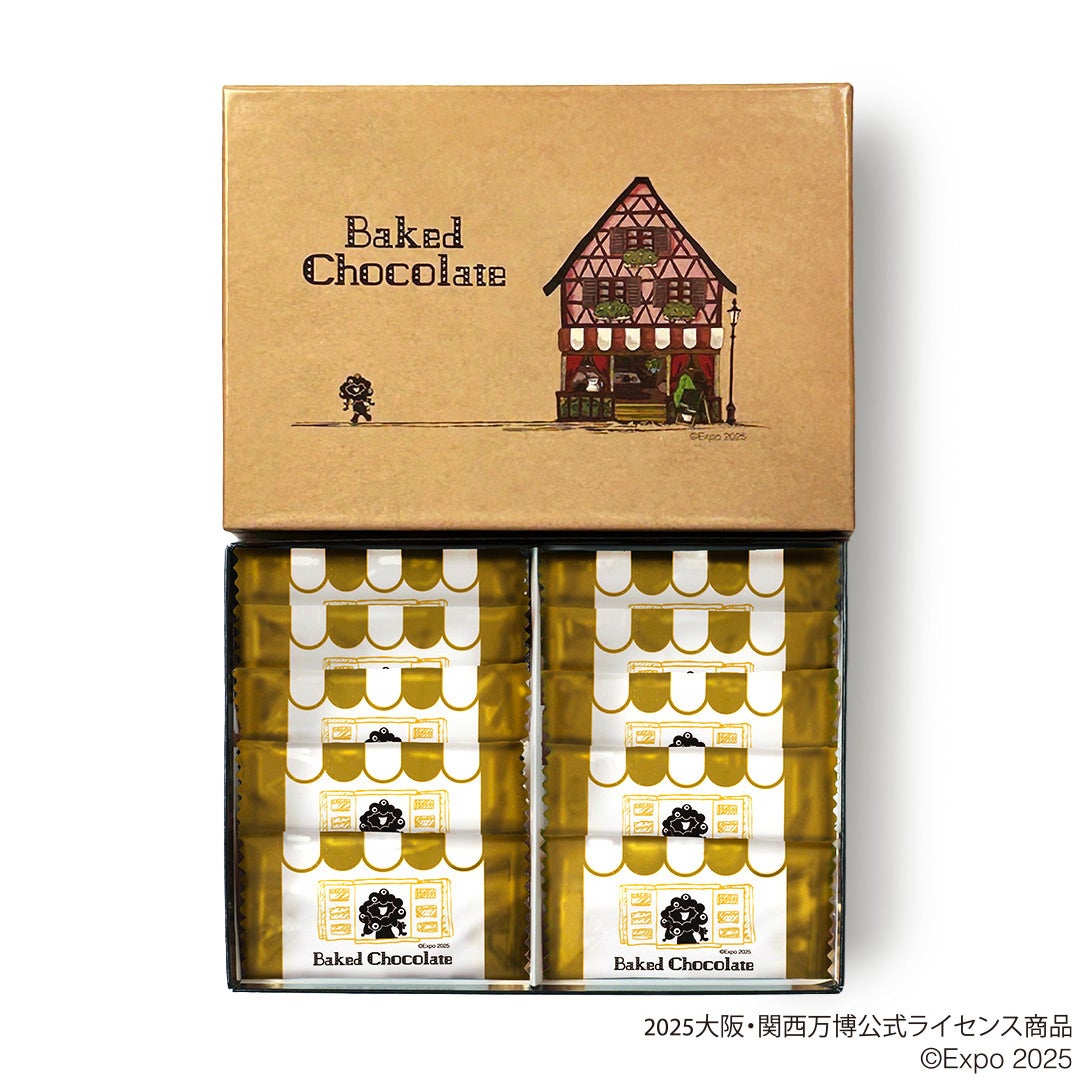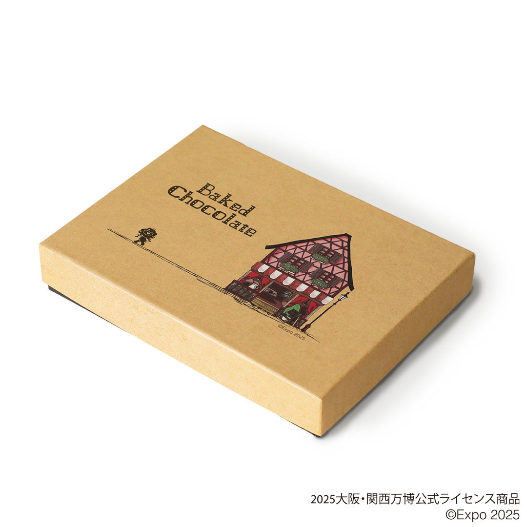 ナッツの食感が心地良いブラックココア生地に、しっとりスイートなミルクチョコレート生地を合わせました。ミャクミャクと可愛いお店をデザインしたパッケージです。