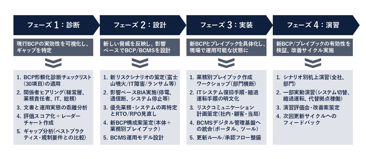 本サービスでは、リスク環境の変化や組織の変化に追随できずに形骸化してしまったBCP/BCMの再構築を行います。具体的には、業務とITの両面から目標復旧時間(RTO)/目標復旧時点(RPO)の整合や代替プロセスの明確化、影響ベースのプレイブックの整備、ダッシュボードによるリアルタイムの可視化、演習による継続的な検証・改善等を通じて、現場の即応力と経営の意思決定を直結させ、変化するリスク環境に適応する事業継続体制への刷新・定着を支援します。