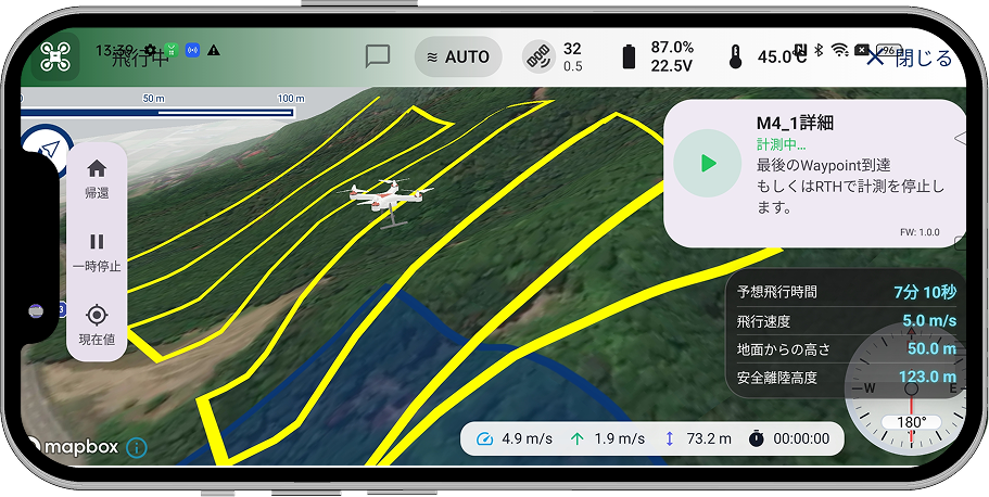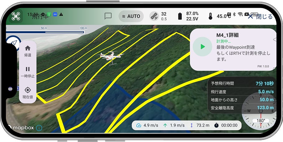 上空からのレーザー照射により、樹木がある状態でも地表の地形データを取得可能です。 急傾斜地など足場の悪い現場へ立ち入る頻度を減らしながら、「森林資源量調査」「路網作設計画」「災害時の状況把握」に必要なデータを収集できます。専用アプリ「mapry mobility」は、地図上で範囲を指定するだけで、地形の起伏に合わせた飛行ルートを自動作成します。 複雑な操縦技術を必要とせず、基本は自動航行で運用できるため、簡易な操作でデータ取得が可能です。