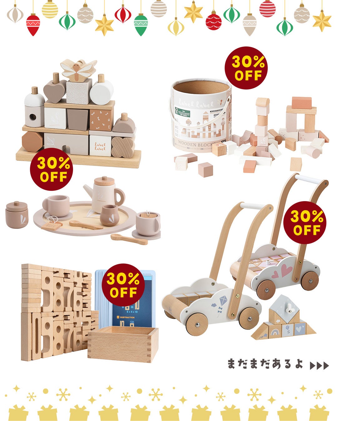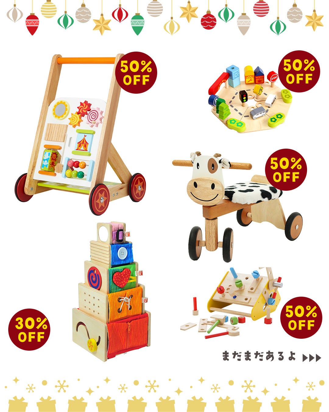 0歳から3歳向けの木のおもちゃや、木のおもちゃをはじめとするベビーグッズを、2日間限りの特別価格でご提供いたします。