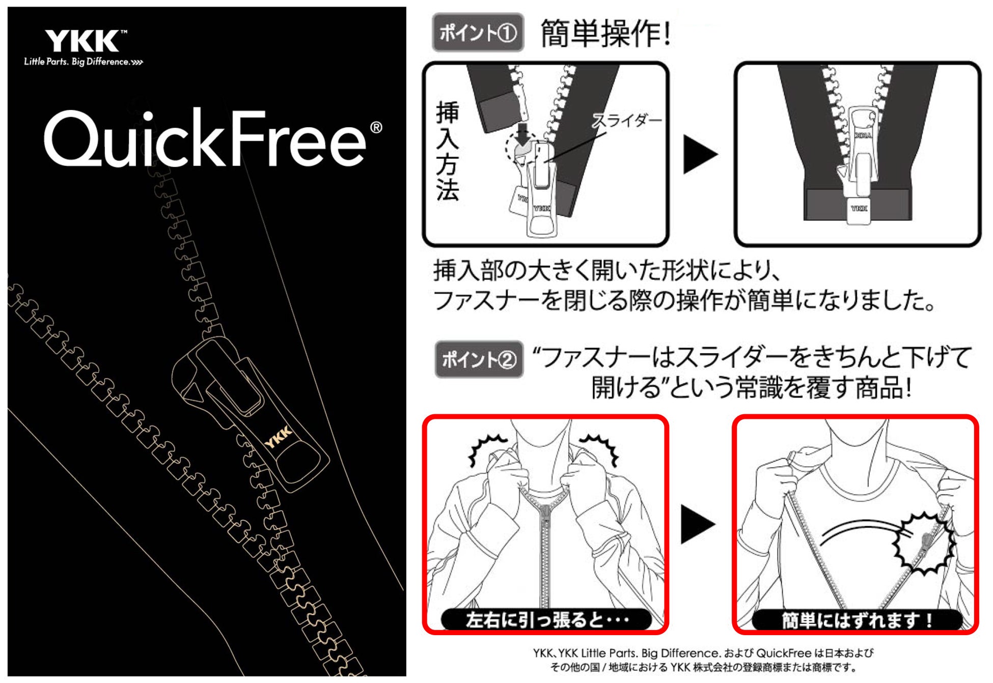 子どもがひとりでファスナーの開閉操作を簡単にでき、大人が子どもに衣服を着せる際の操作性向上に配慮したファスナーです。スライダーの形状を変え視認性を向上し、ピン(蝶棒)を受ける面積を広げることにより、挿し間違えを軽減しました。また、左右に一定荷重が加わるとスライダーが「パチッ」と外れて、スライダーを下げなくてもファスナーが開く解放機能を備えています。