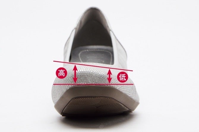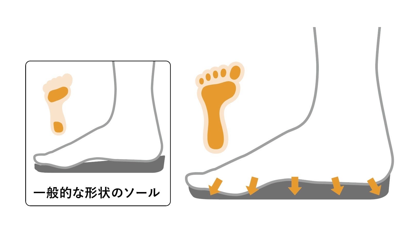 1. 美脚に見せるスタイリッシュなデザインと開放感のある履き心地を両立するために、足の構造を熟知した上で、足裏を平面ではなく立体的にサポートする木型を開発。快適な歩行に重要な足本来が持つ立体構造は、サポートが無いと崩れやすいという難点がありますが、靴で足の構造を再現することにより、足も靴も収まりが良く、スマートなシルエットでストレスフリーな履き心地にすることを可能にしています。