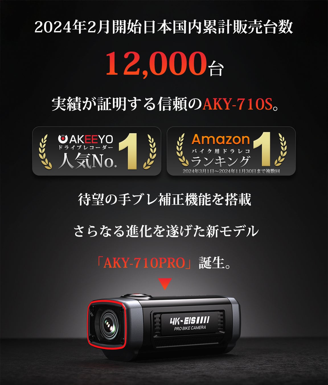 大好評のAKY-710Sシリーズが遂にパワーアップ。Amazonバイクドラレコランキング常時上位の信頼と実績から生まれた次世代モデルが登場。ユーザーの声を活かし、プロ級の手ブレ補正機能を搭載し、さらなる高みへ。