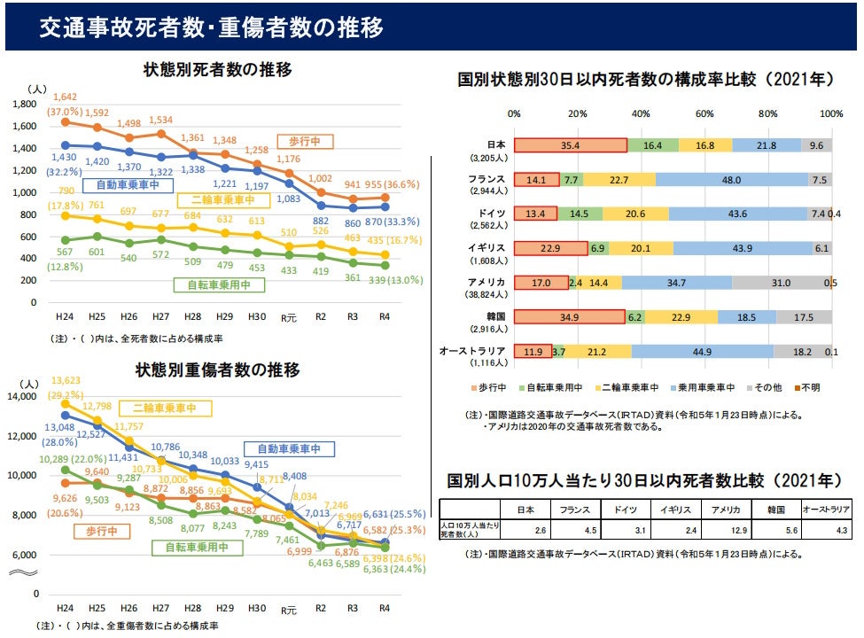 日本の交通事故統計によると、年間3,000人以上の方が交通事故で亡くなられ、その内訳は歩行者、自転車、二輪車と多岐にわたります。特に近年では、様々な交通手段が関わる事故が増加しており、交通安全対策の重要性が高まっています
