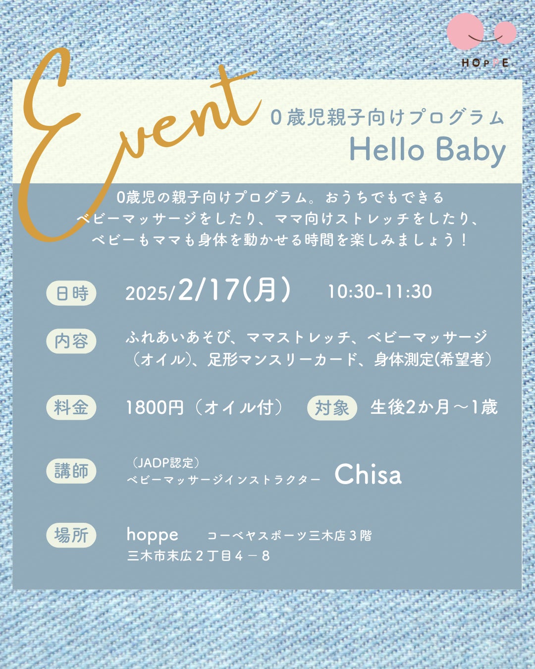 特定非営利活動法人ほっぺ(兵庫県三木市・代表:大森 奈津子)は親子向けイベントとして、2025年2月17日(月)にhoppe(コーベヤスポーツ三木店3階)にて、ふれあいあそびやベビーマッサージ体験ができる「Hello Baby」を開催いたします。