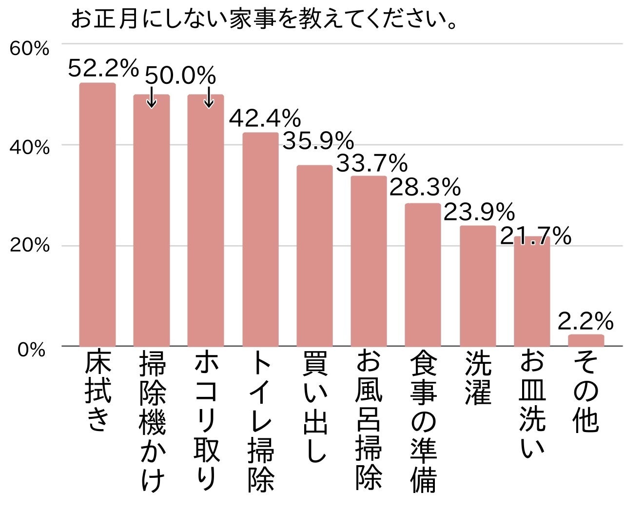 今回のアンケートでも、約6割の方がお正月に家事を普段より減らすことがわかりましたが、具体的にどのような家事を減らして負担を軽くしているのか尋ねてみました。