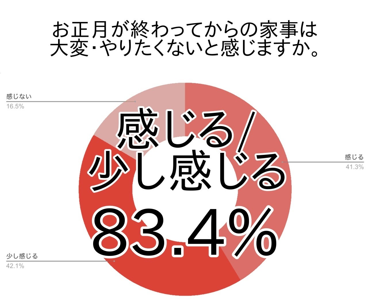 三が日を中心に家事をしない方が多いようですが、お正月期間が明けると、日常が動き出し、たまっていた家事をこなすことが加わる等、大変に感じることが何かと多いのではないでしょうか。そこでアンケートでは、お正月が終わってからの家事は大変・やりたくないと感じるかを尋ねてみました。