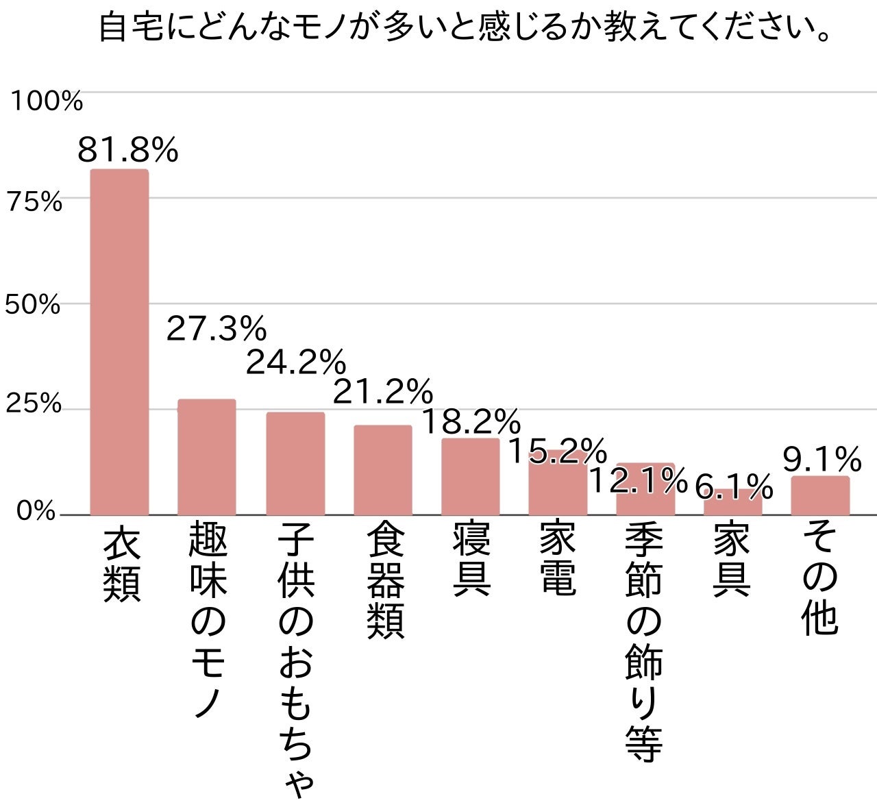 自宅のモノの多さが家事のスムーズさを阻む要因となっていることが分かりましたが、具体的に多くて困っているものはどのようなものなのでしょうか。アンケートで尋ねてみました。